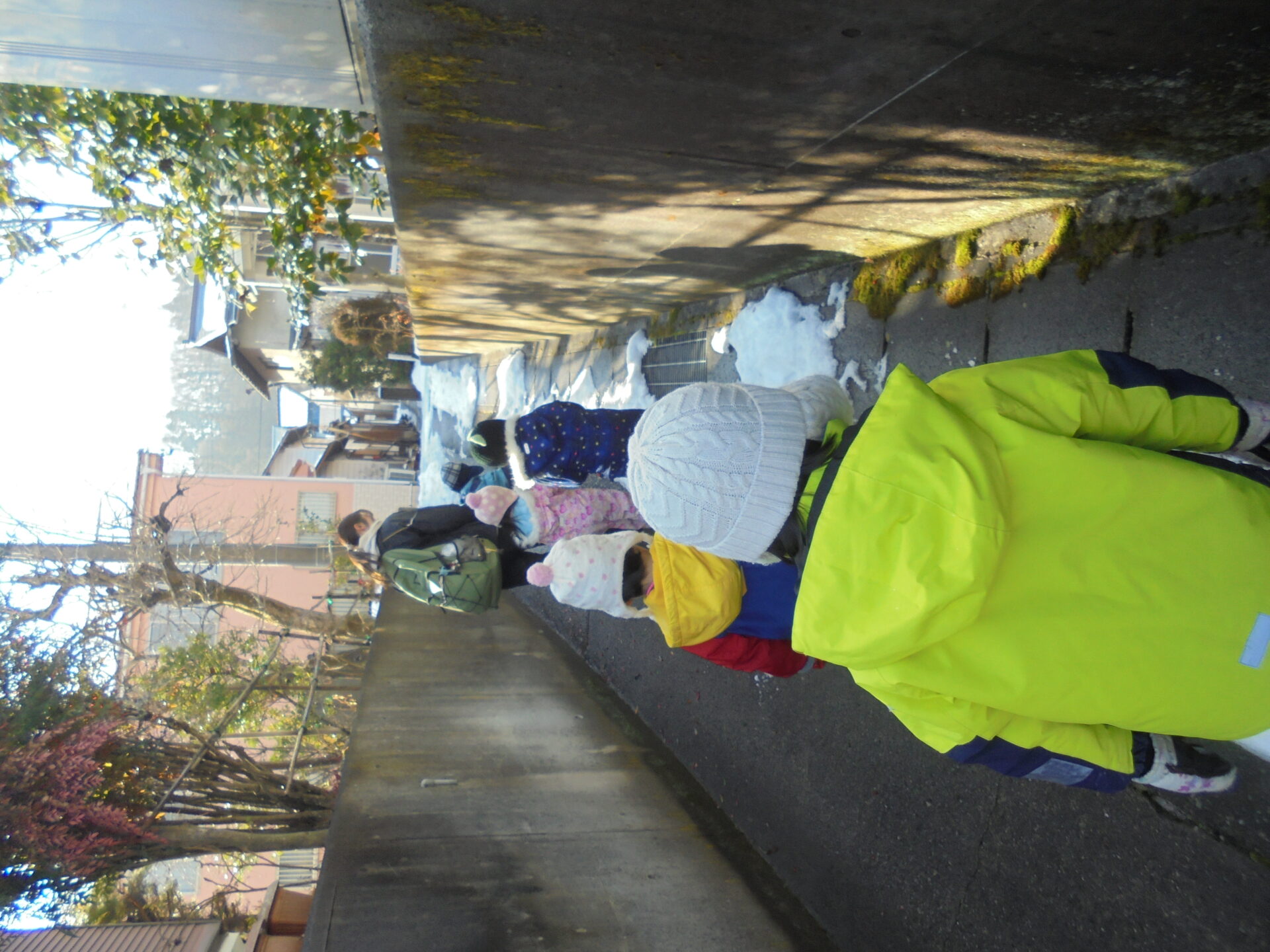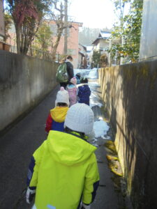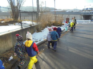 足跡探しを楽しんでほしいと思い、事前の下見で小動物の足跡であることを確認してから散歩に出かけました。雪がまだ残っている場所では予想していた通り、小動物の足跡を沢山見つけることができました。『これは犬かな?猫の足跡かな?』と子ども同士で考えている姿がとても楽しそうでした。