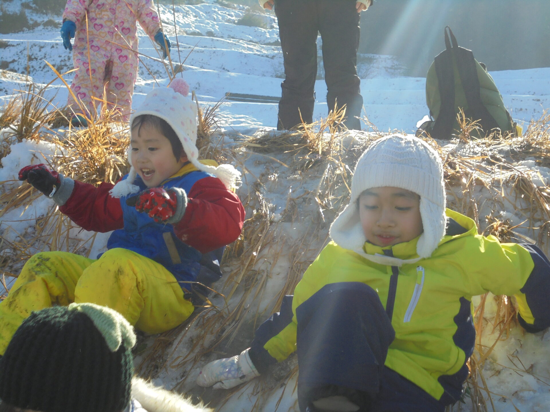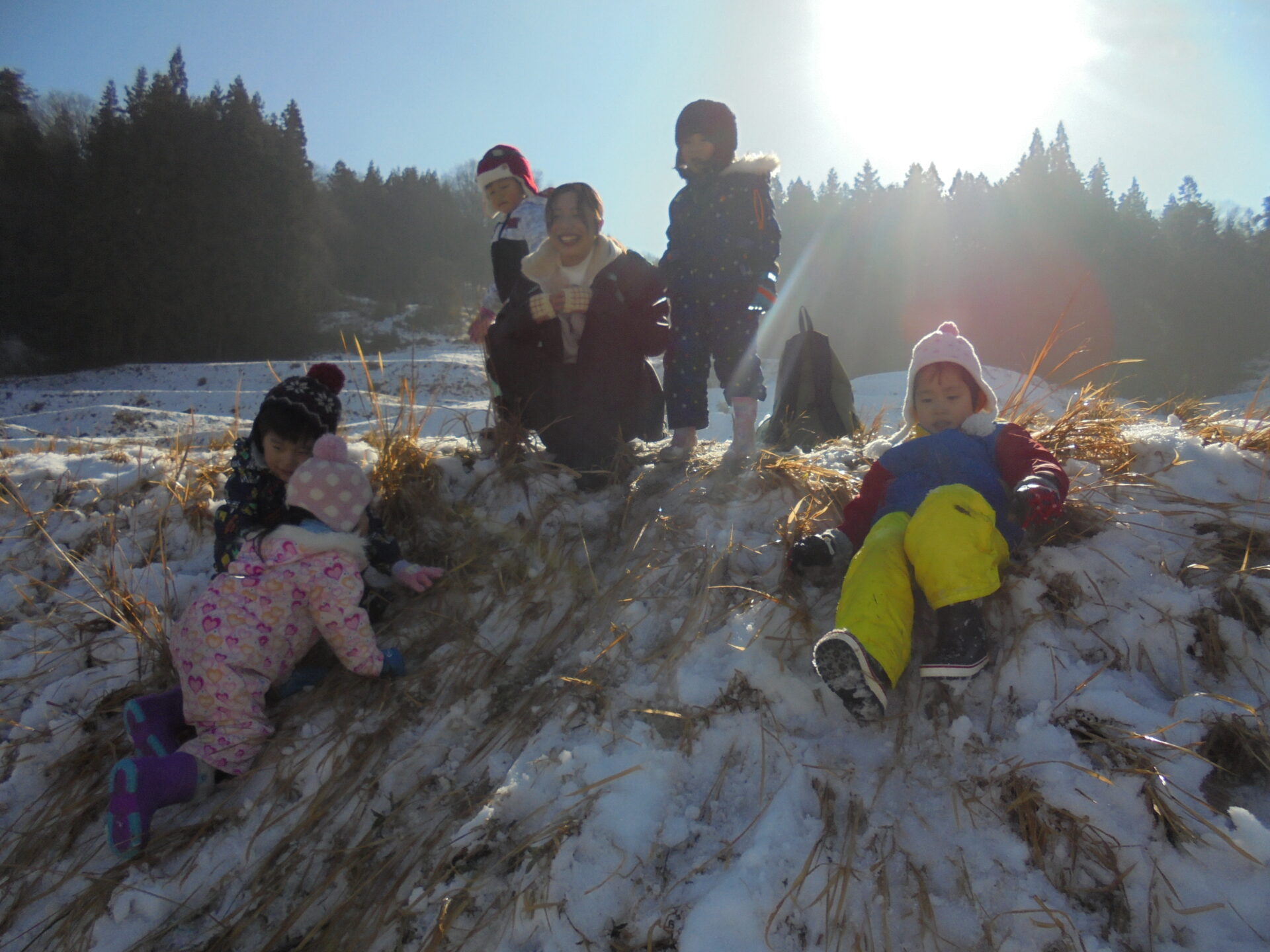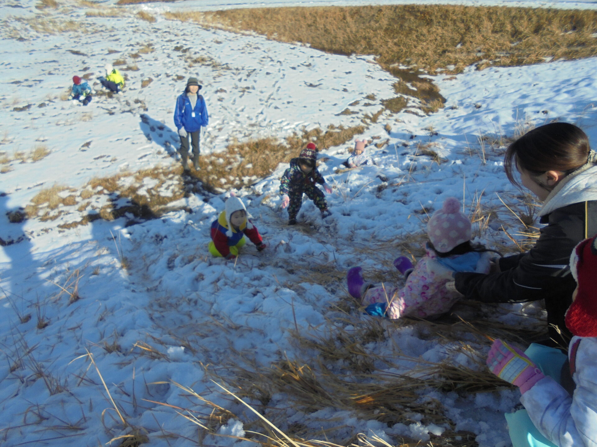また、今回の土手滑りは初体験!子ども達は何度かそり遊びで滑る感覚を経験していたので怖がることなく興味を持って、土手滑りにも挑戦していました。斜面を登るのは滑るので大変そうでしたが、登り切った後に滑る疾走感は今までに経験したことのない楽しさだったようで、『楽しいー!!』という気持ちがすごく伝わってきました。