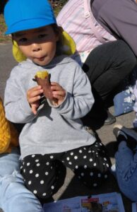 焼き芋以外にも、月組さんは茶巾絞りを作りました。作ったものを保育園の小さなお友達に食べてもらい、照れながらも喜んでいました。