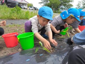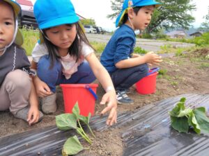 春、さつま芋の苗を園の畑に植えました。苗をそっと持ち、水や土の布団を優しくかけてくれる子供たち。
