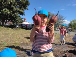 子ども達に、「このさつま芋、どうしたい?」と聞いてみると、「やきいもにしたい」「おみそしる」「もってかえりたい」と色々な考えがあがりました。