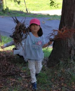 近くの神社で杉の葉や小枝集め。袋いっぱいにして、保育園に持って帰ってきました。
