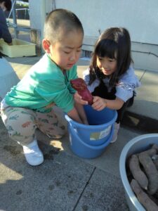 まずは芋洗い。芋に付いた土をよく落とします。でこぼこしているさつま芋、丁寧に洗ってくれました。