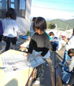 洗った芋を新聞紙で包みます。「なかなかむずかしい…」