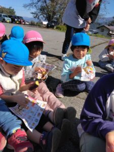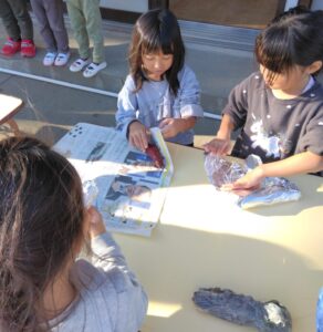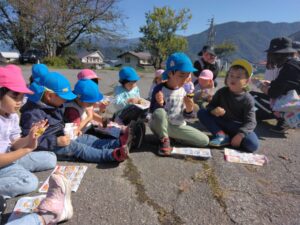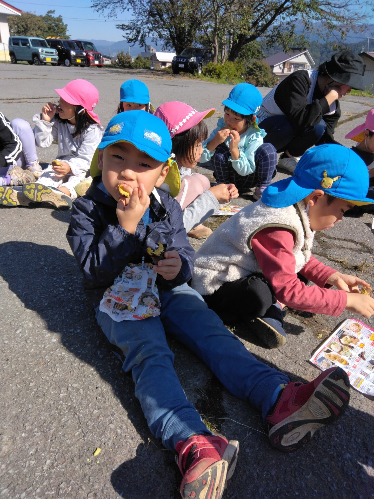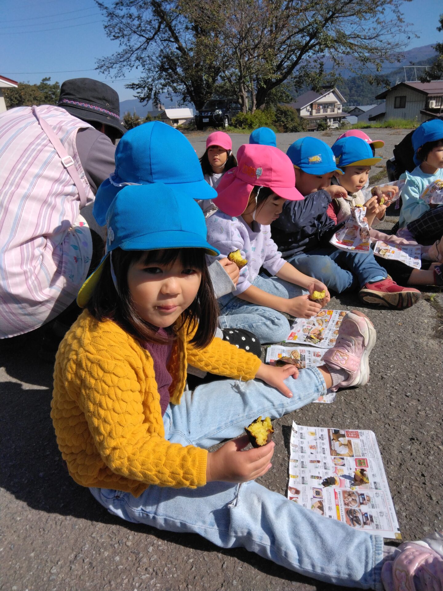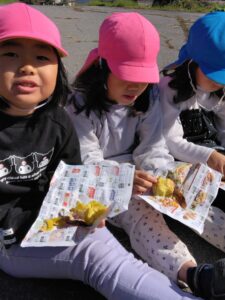 また、焼き立ての焼き芋を食べて「やわらかい」「買うお芋よりもおいしい」「お家で食べたのと違う」と一人ひとりの視点で味わい、言葉にしていました。