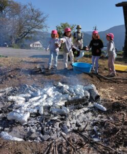 芋を焼くための「おき火」に、アルミを巻いた芋を投げ入れる月組さん(5歳児)です。