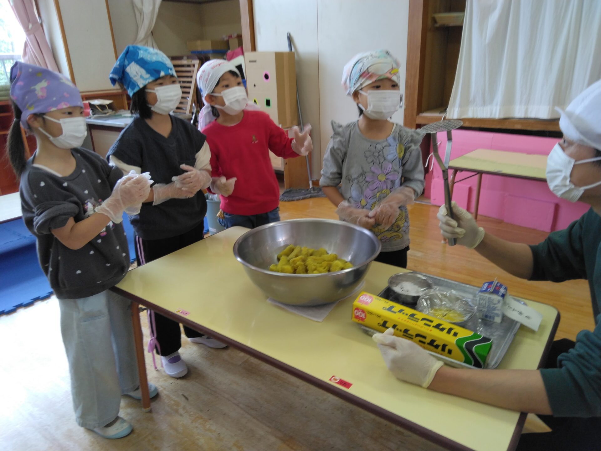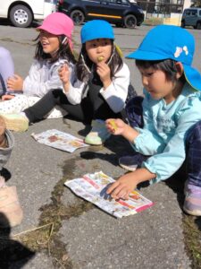 焼き芋以外にも、月組さんは茶巾絞りを作りました。作ったものを保育園の小さなお友達に食べてもらい、照れながらも喜んでいました。