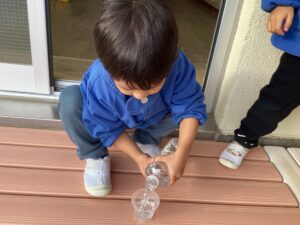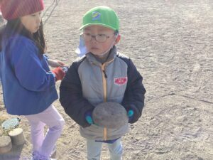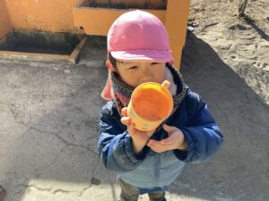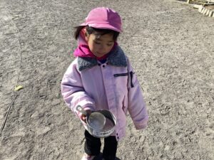 ・寒さから戸外へ出ることを嫌がっていた子も氷ができていることを知ると興味津々で観察したり触ってみたりしていつの間にか戸外遊びを楽しむ姿が見られました。