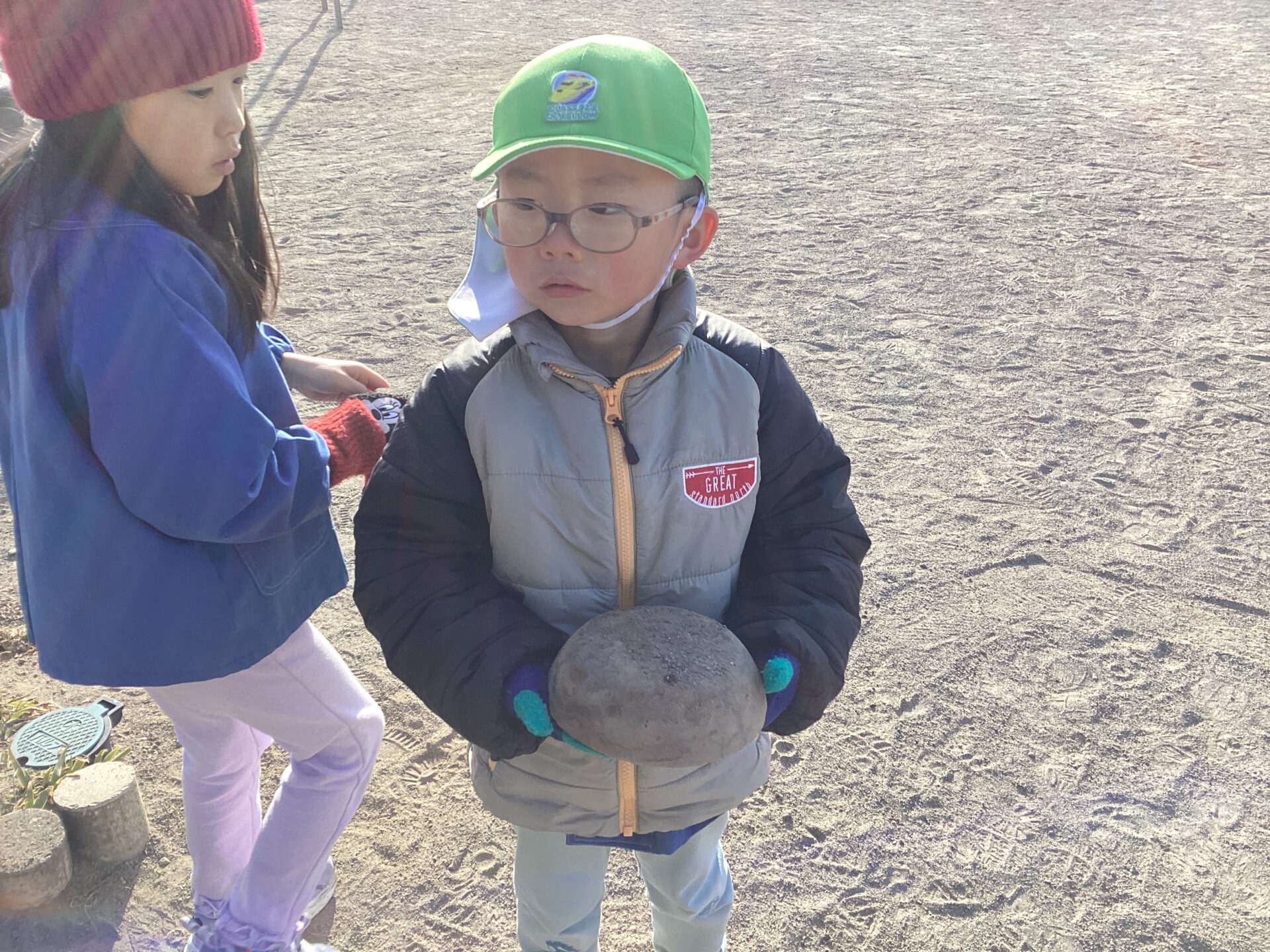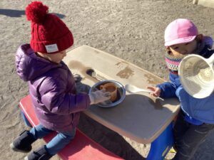 ・寒波の影響で戸外はとても寒い日が続いていますが、その中で子ども達は、園庭にできた霜柱を踏んでみたりバケツに張った氷を触ったりすることを楽しむ姿が見られました。様々な容器にできた氷を取り出して大きさを比べたり食べ物に見立てて遊びの中に取り入れたりして遊ぶことを楽しんでいました。