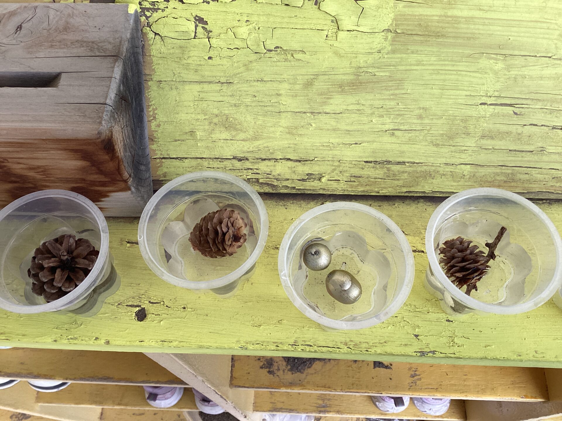 どんぐりや松ぼっくりを入れてみたよ!どんな氷が出来上がるか楽しみだな!