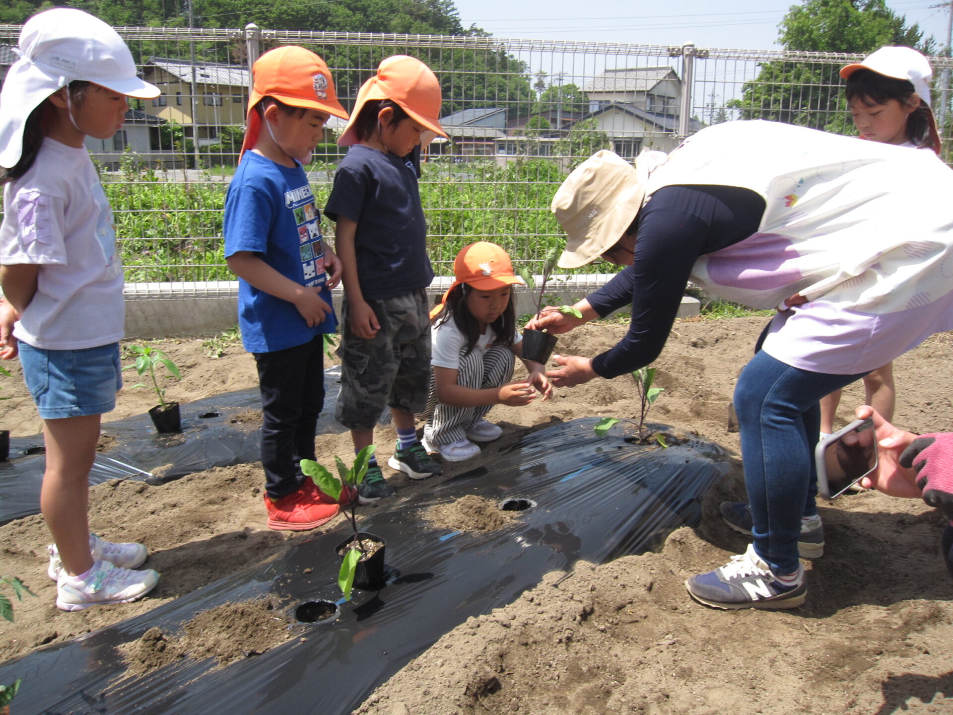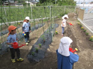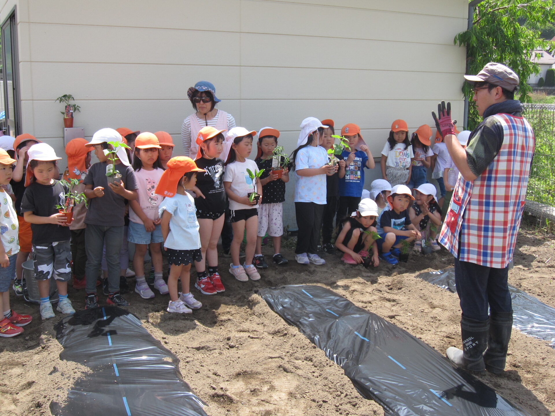 年長クラスの活動の一つである畑。当園では園舎の一角でいろんな野菜を植えています。5月に苗植えをしました。みんなで保育士の説明を聞いています。