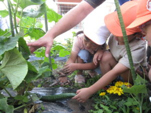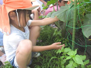 きゅうりの収穫では、「トゲトゲしてて痛い!!」と苦戦する姿も。