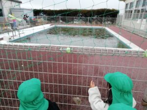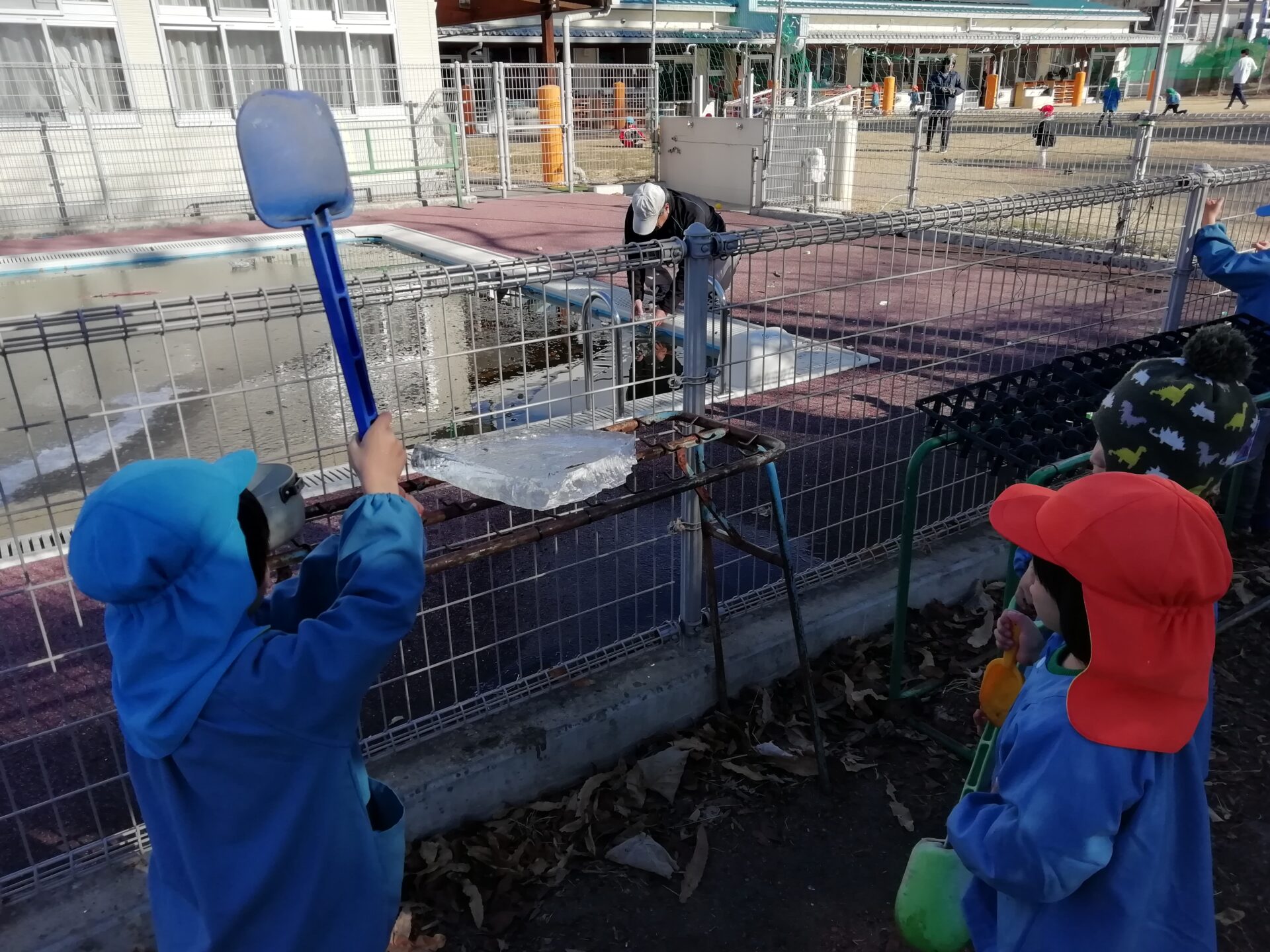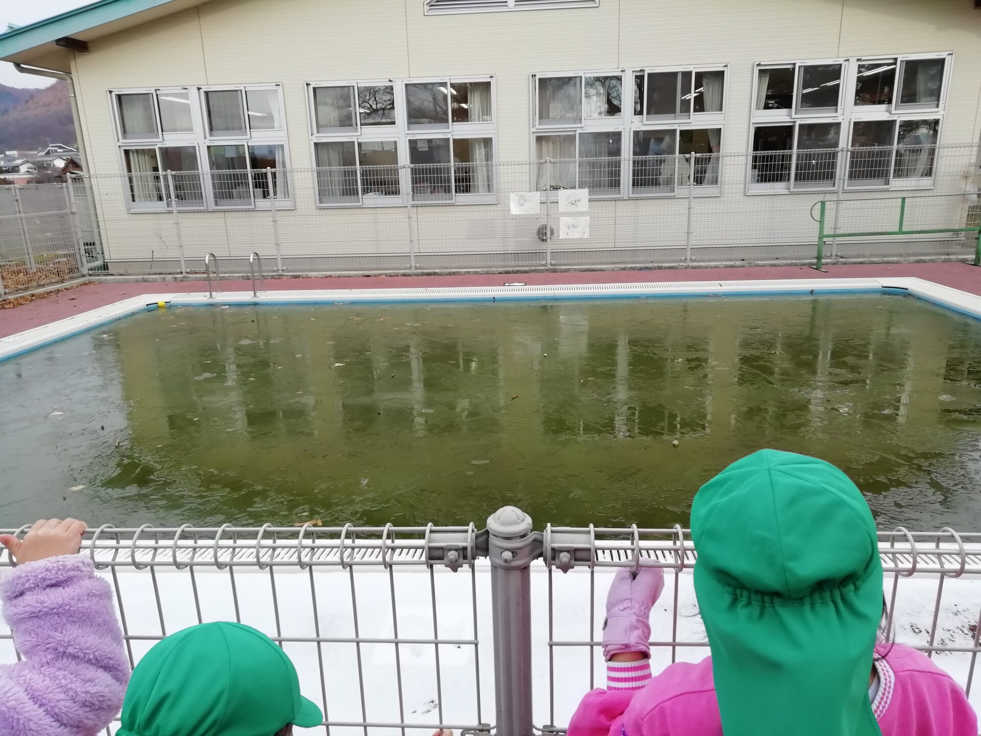 12月のある寒い日、こども達が園庭にあるプールに薄く張っている氷を発見しました。