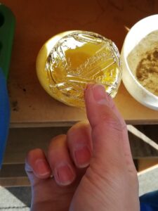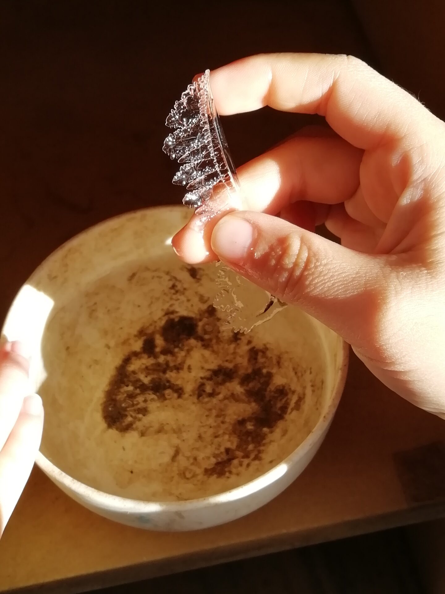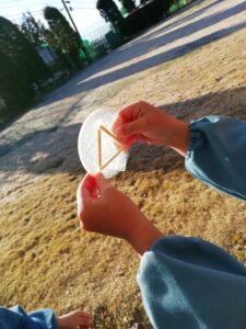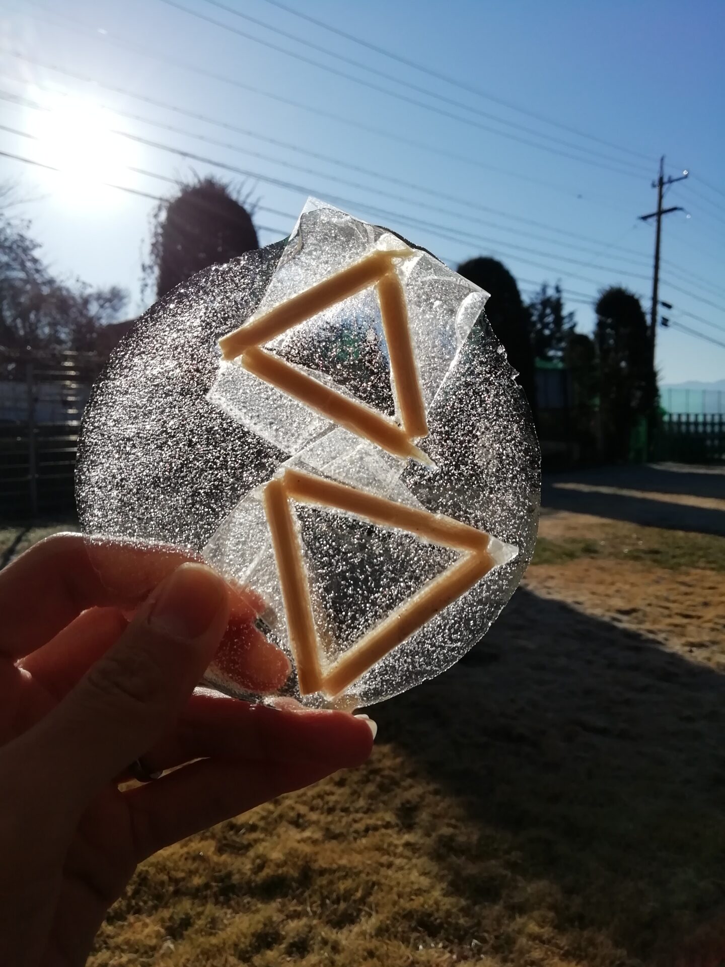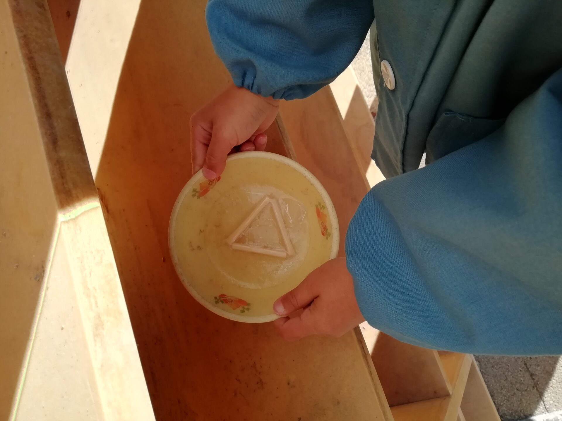 やっと出来た氷は、小さく薄い!でも世界で一つの自分たちで作った氷!おもちゃの形に合わせて出来た丸い氷、「三角は作れない?」の声で三角の入れ物を探しましたが見つからず…無いなら作ろう!お皿に張った水の中に割りばしで三角を作って…