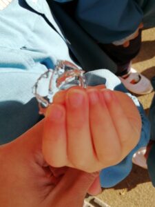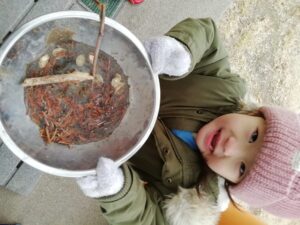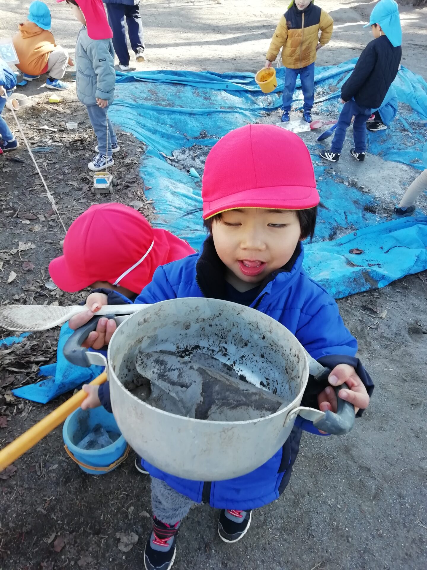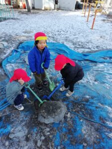 また、年末年始のお休み中、誰にも触れられることなくじわじわと厚く大きく育った氷もまた、身近で感じていた氷とは違い、運ぶ・持つ・砕く・融かすには、いつも以上にパワーがいるということにも気づき、驚き、喜んでいました。只々分厚い氷に大興奮の2歳児、お兄さんお姉さんのように持ち上げようと奮闘する年少児、友だちと協力する年中児、自分たちの遊びを楽しみつつも小さいこどもを気にかけ手助けする年長児。休み明けの大発見からそれぞれの成長の過程が垣間見える氷遊びとなりました。
