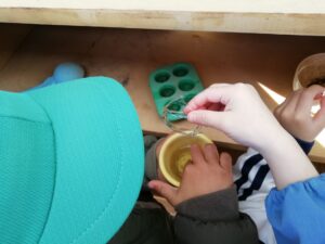 プールの氷発見からの自分たちで作ってみることになった『氷』。年中児は気持ちを相手に伝えたり聞いたり受け止めたりが出来始めている時期で、お互い自分なりの考えを出し合って完成を心待ちにしていました。