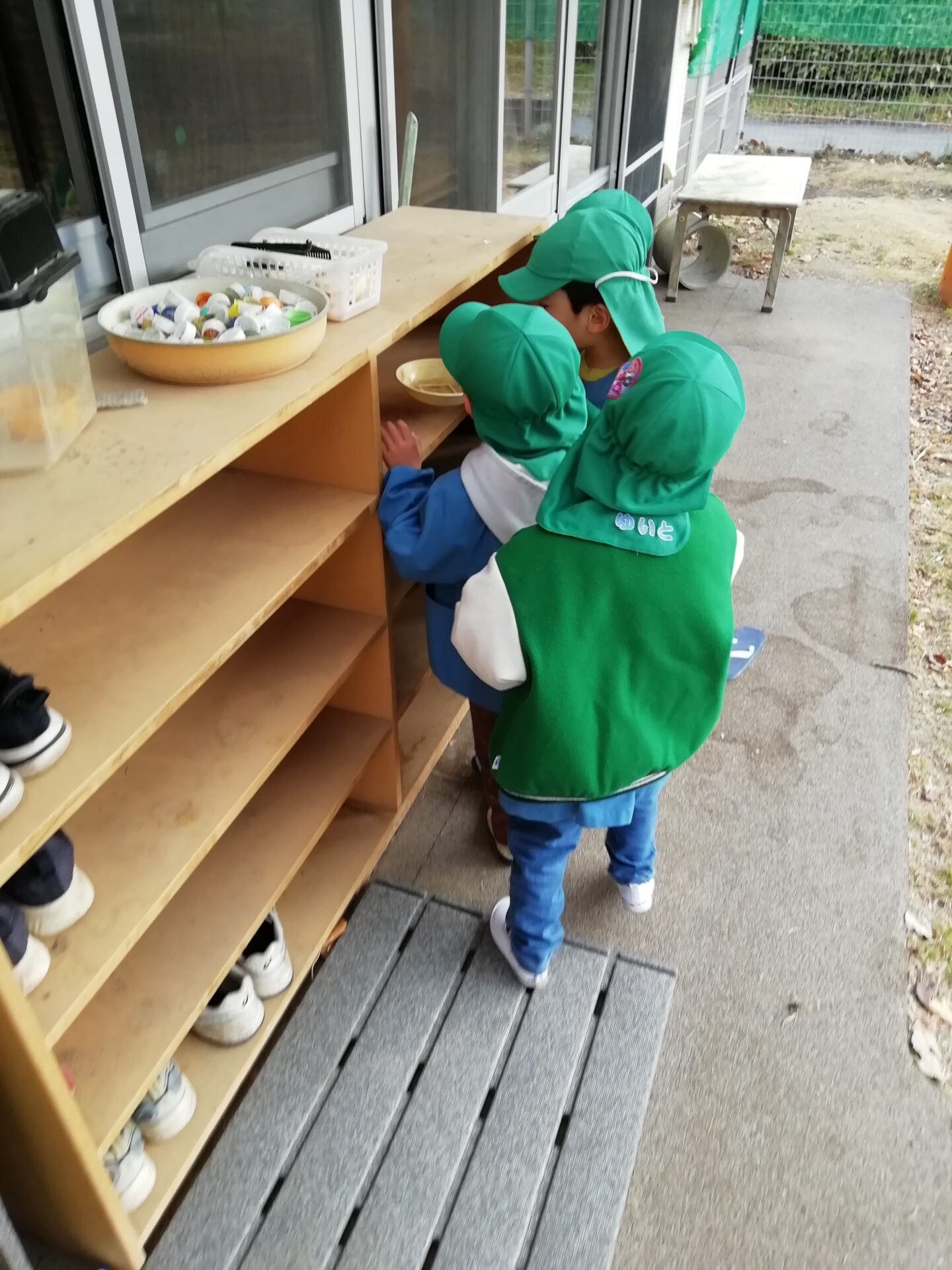 年中児の氷作りでは、自然に出来た氷もそれぞれの遊び方がありますが、こども達の思い描いた構想に一緒に取り組み〝工夫〟や〝意欲〟〝想像力〟の育ちを願いこども達一人ひとりの心の動きにスポットを当ててみました。