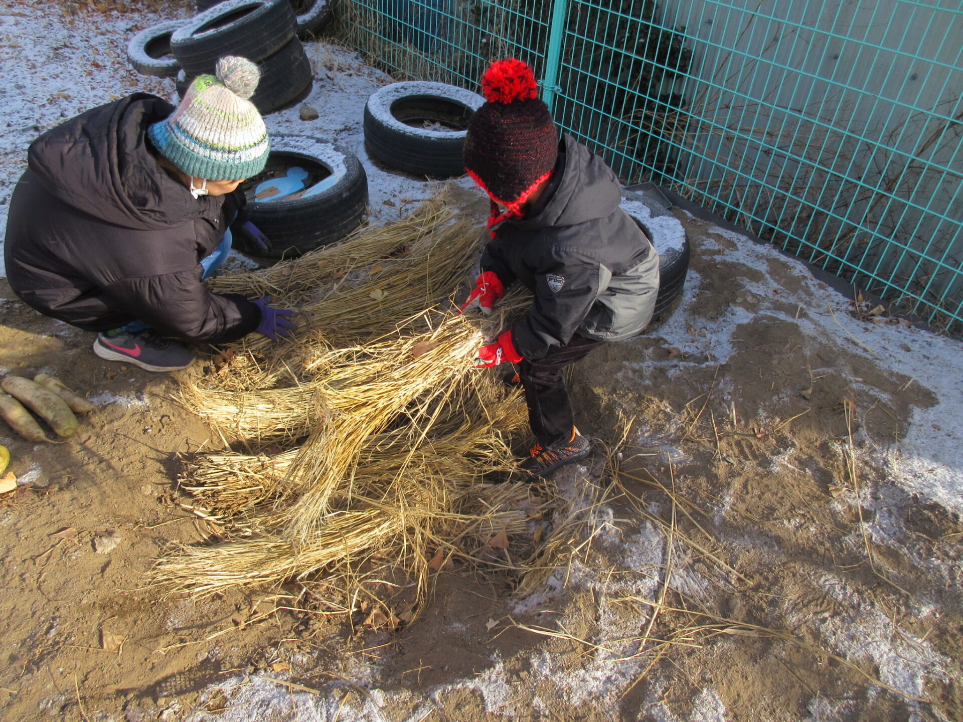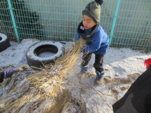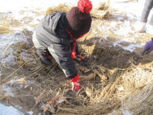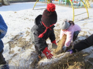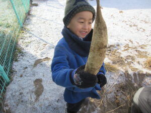 11月になると朝晩の冷え込みが強くなり霜が降る日が多くなってきました。保育園でたくさんの大根ができたので霜にやられてしまう前に収穫をしました。収穫した大根を保存しておくために園庭に穴を掘り「室」を作りました。穴の中に大根を入れて藁と土を被せて完成ですが、子ども達は「土の中に入れて大丈夫かな」と心配そうにしていました。給食で大根のメニューがある時は子ども達が掘り出します。穴を掘ると収穫した時のままの大根が!三ヶ月近く経った今でも土の中で元気にしている大根がたくさんありました。
