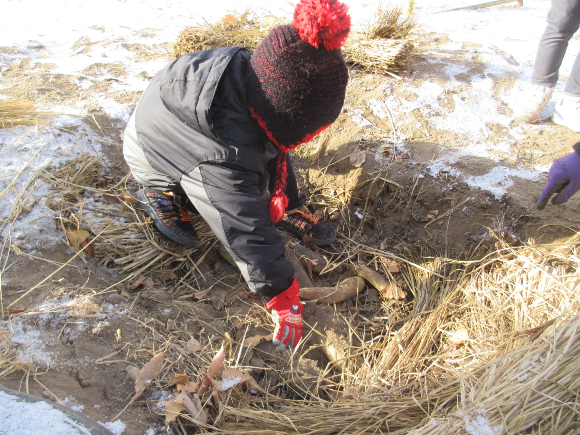 ・土や藁をどかしながら「おひさまが当たっても冷蔵庫みたいにひんやりしてる」と土の中の温度の違いに驚く姿がありました。