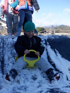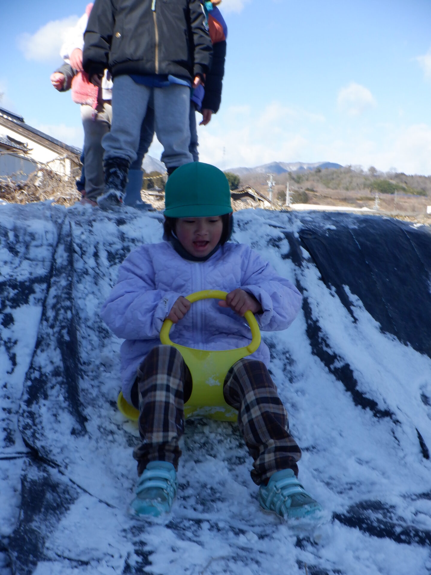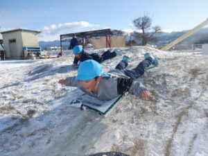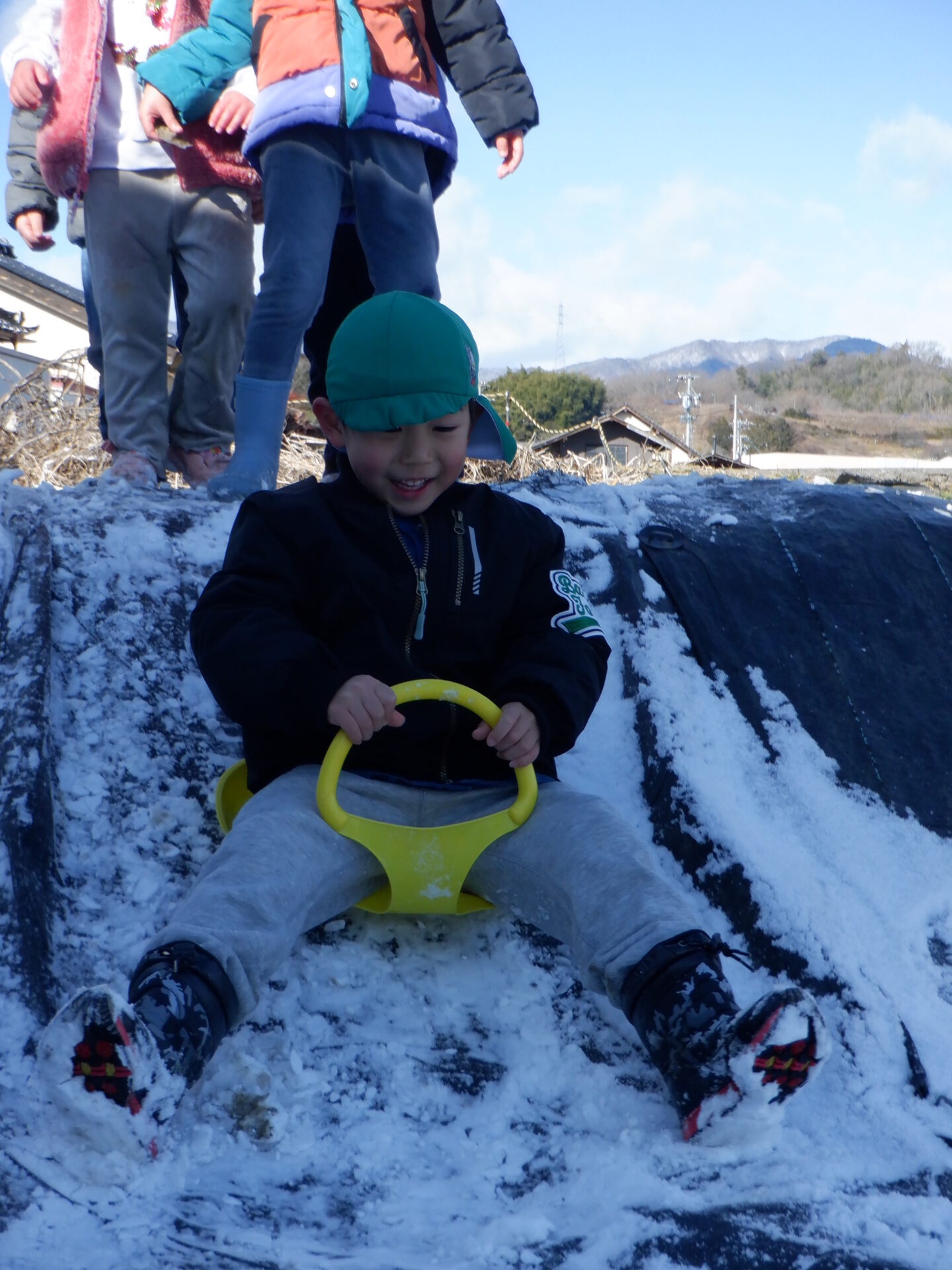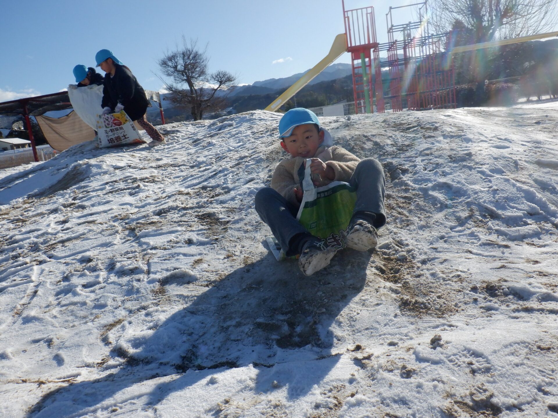保育園裏の畑の坂ではソリ遊びをしました。バランスとってシュー!!!
