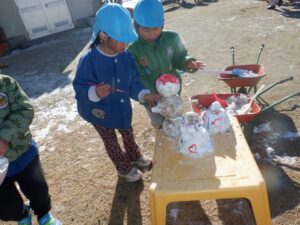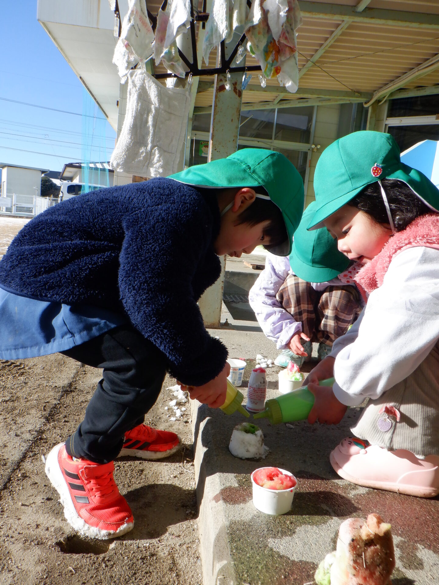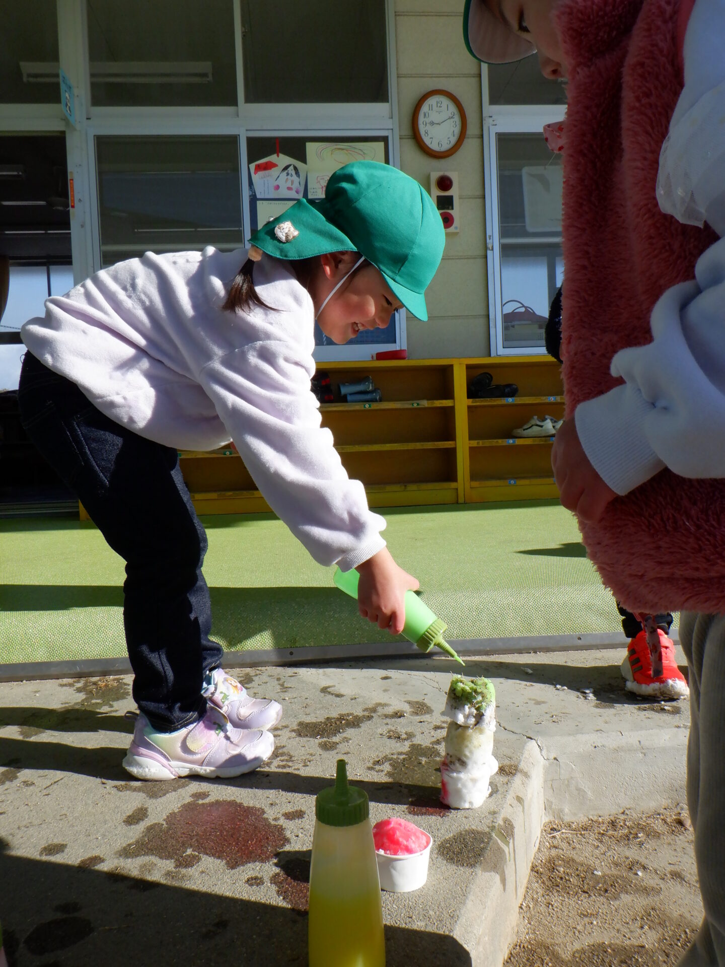 「かき氷を作る~!」と雪を集める年中児。カップに入れた氷に味付けをしてお店を開いていました。