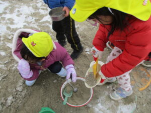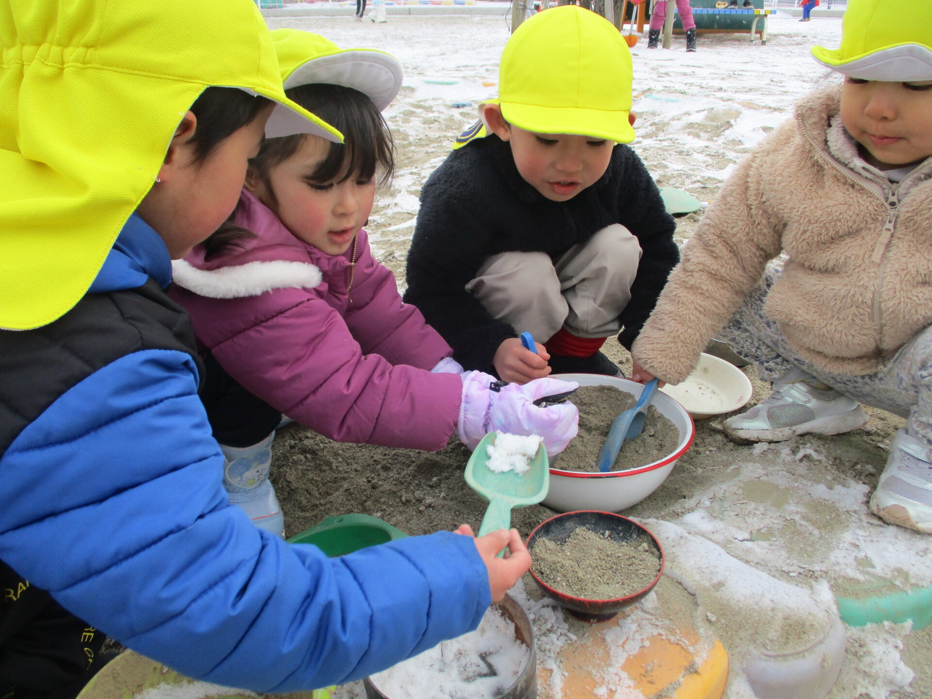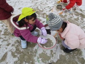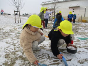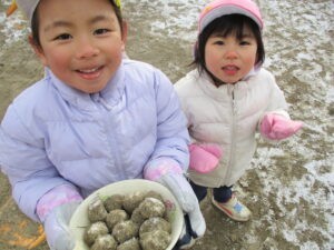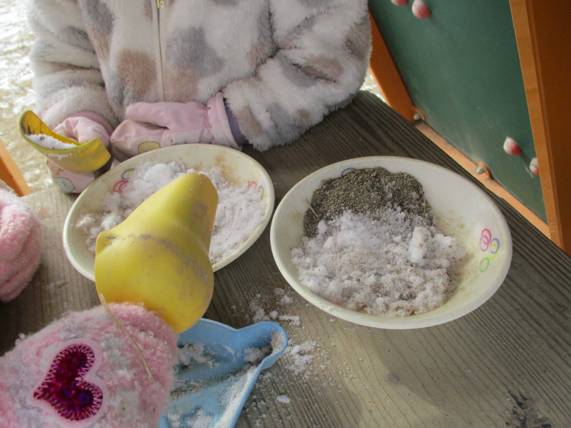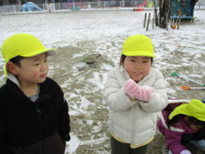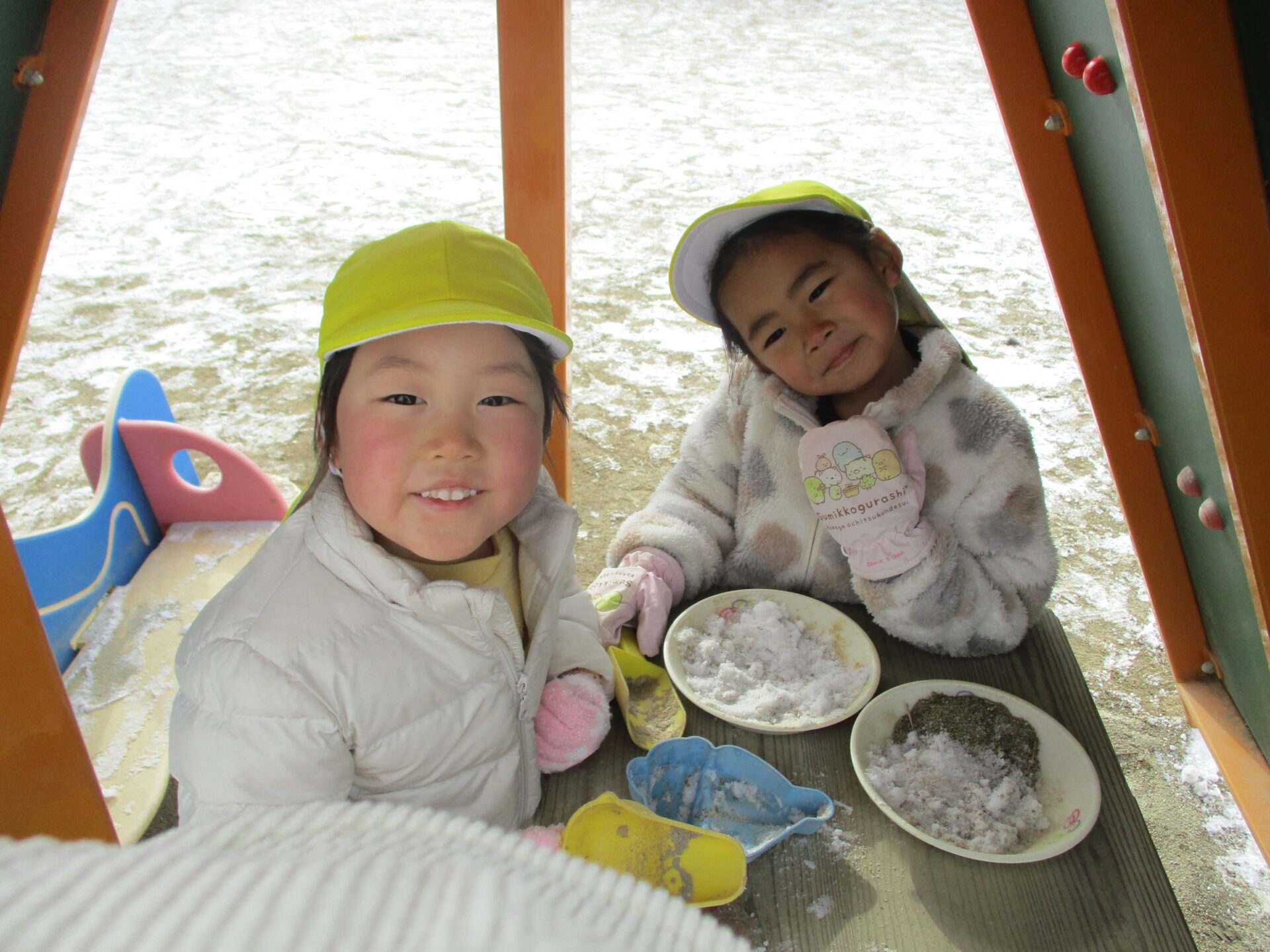 ままごとをしたり、小さな雪だるまを作ったりといつもは手に入らない自然からのプレゼントをそれぞれが楽しんでいる姿がありました。