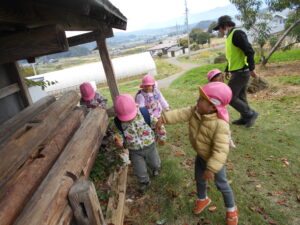 初めて行く場所だったのでたくさんの発見や驚きがあり、楽しい経験になったようです。落ち葉や小枝、木の実などを見つけて自分たちで面白い遊びを考えていることに感心しました。また、農家さんに声をかけていただいたことで、りんご採りの貴重な体験ができました。地域の方に温かく見守っていただいていることを改めて感じました。
