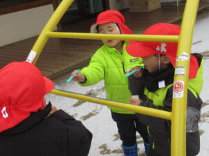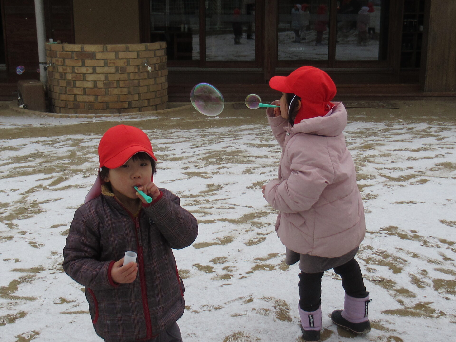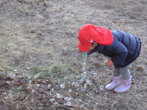 次の日は、畑に行って実験をつづけたところ、地面に落ちたしゃぼん玉が凍ることを発見!「しゃぼん玉、凍った~‼」寒い寒いと言いながらの実験でしたが、寒さがこんな面白いことをみせてくれることに、子どもたちは心を動かしていました。