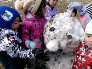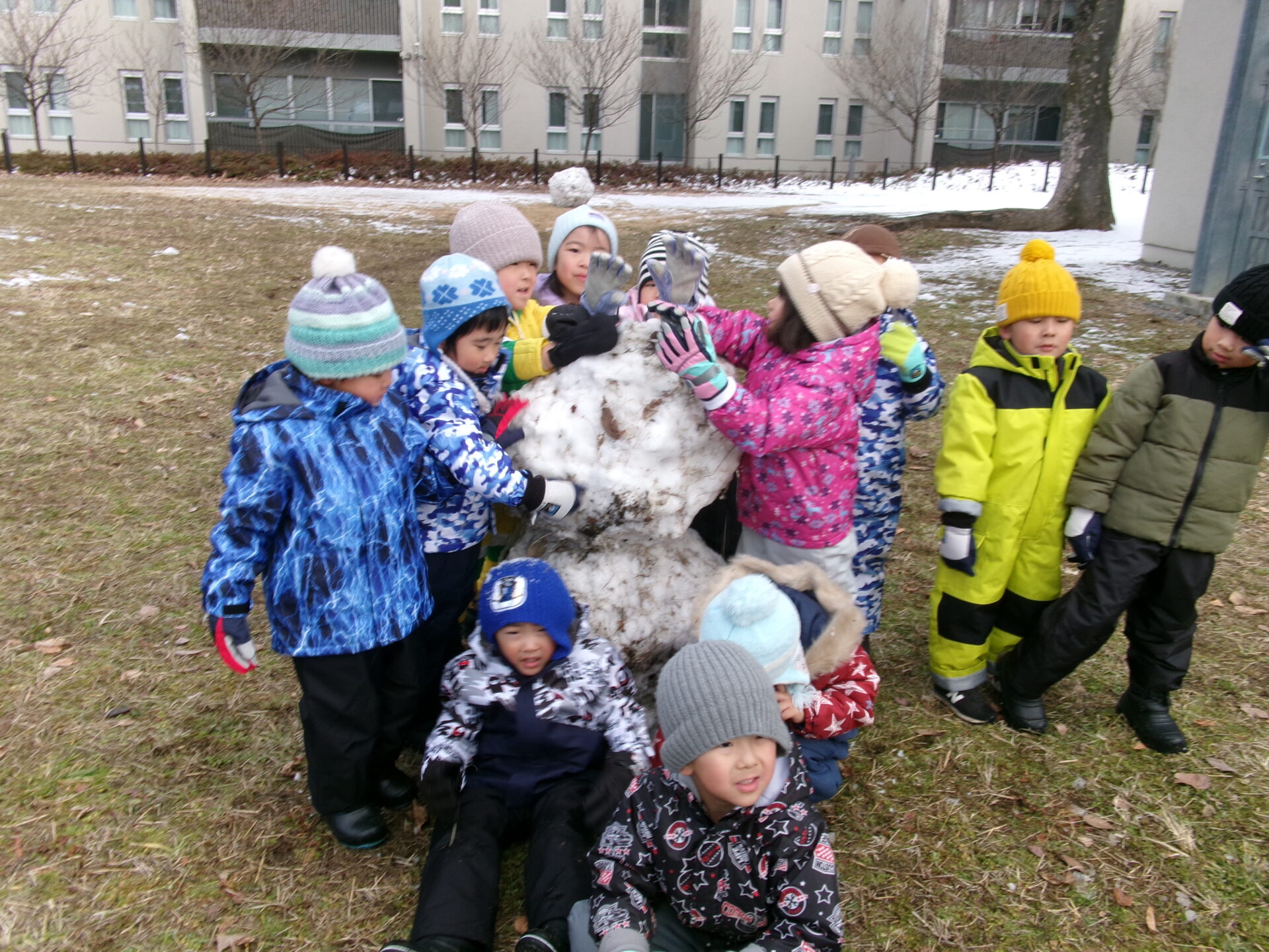 園近くのSL広場では、幼児組の子ども達が大きな雪だるま作りに挑戦!