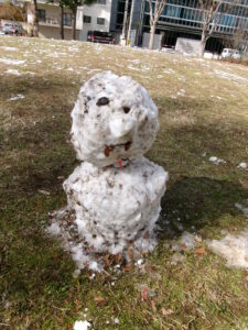 顔のパーツになりそうな葉っぱや枝を付け、頭には雪の帽子を乗せて…