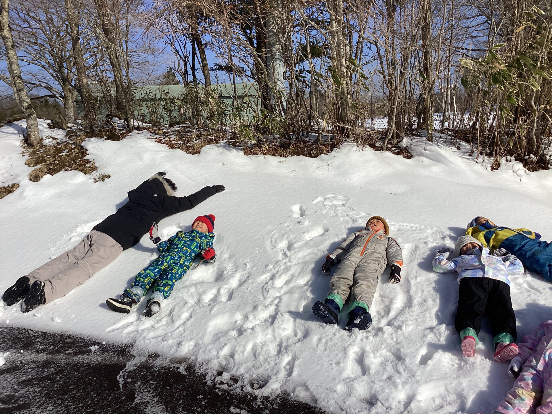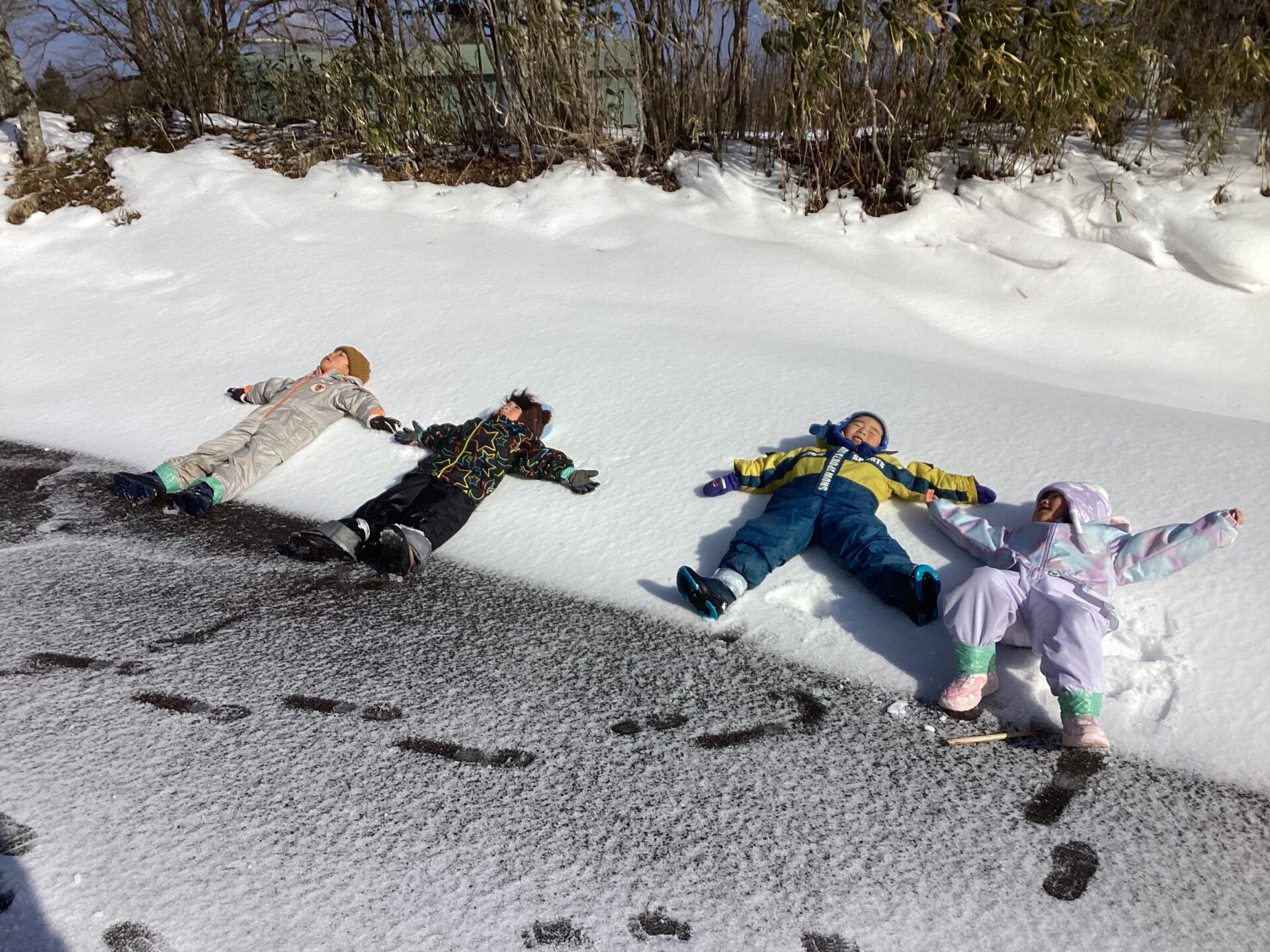 次々と雪のベッドに川の字になって寝そべります。