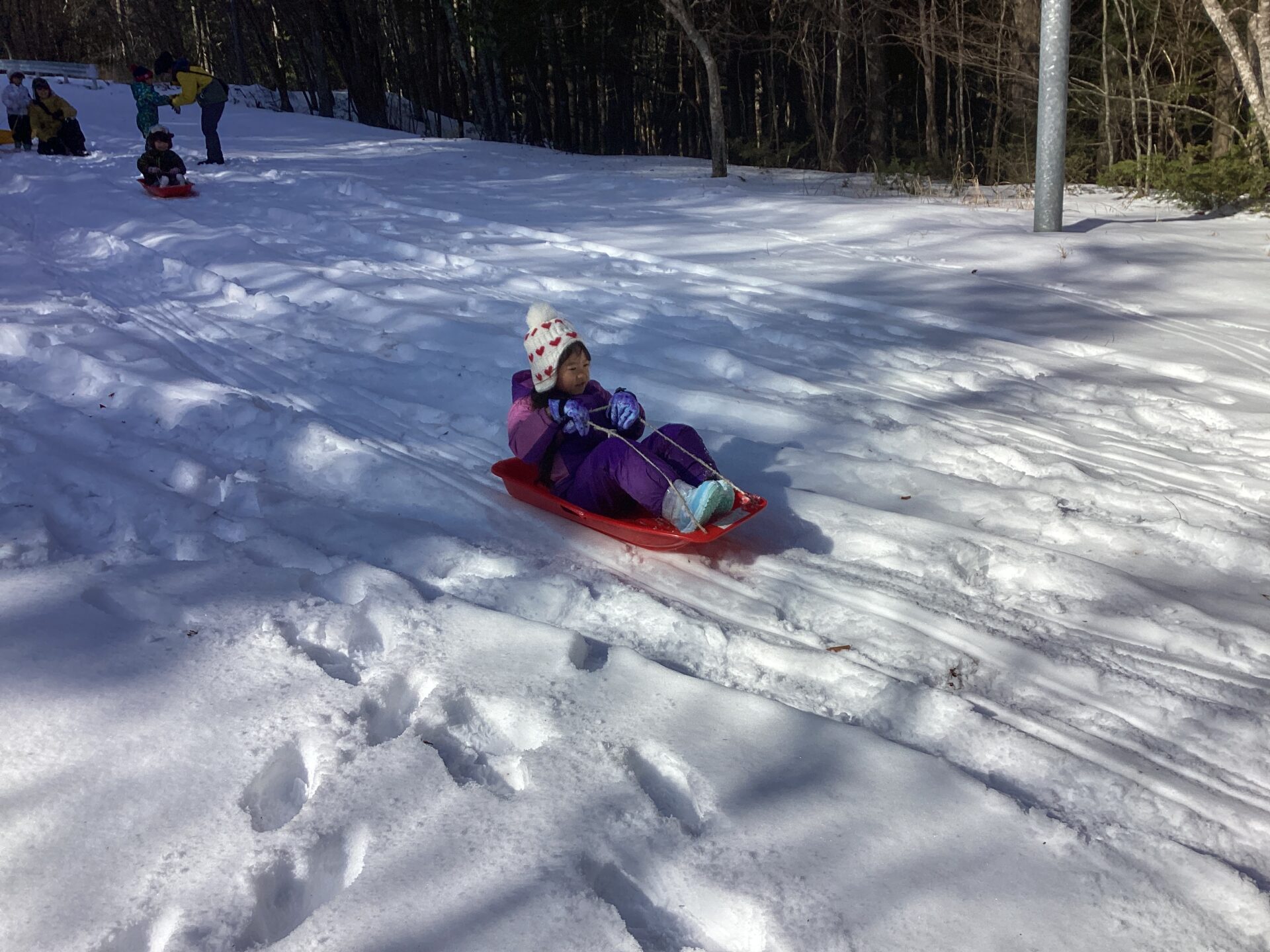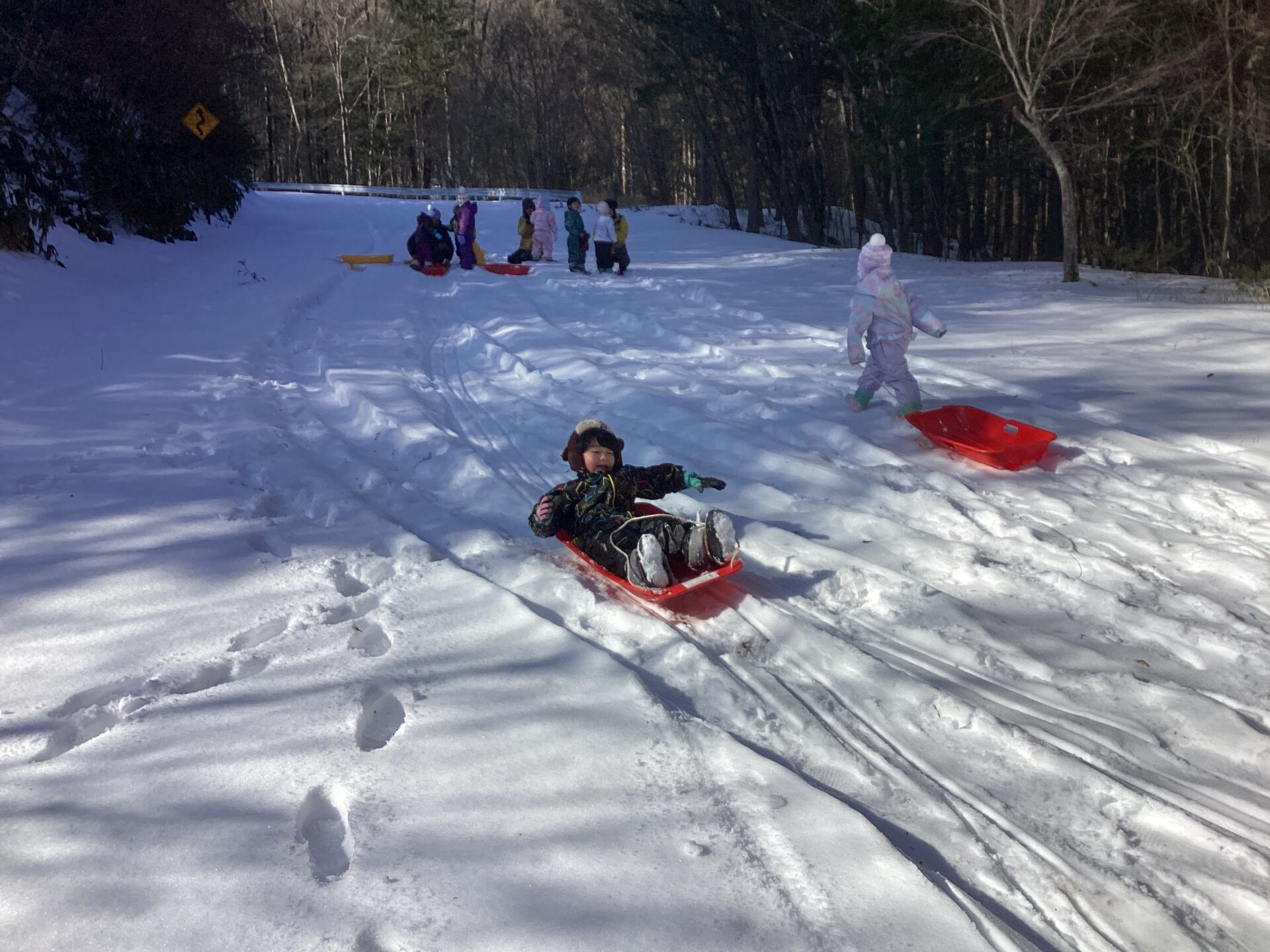 保育園では長距離でソリ滑りをする場所がないので、大喜びで滑っています!