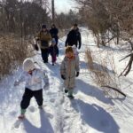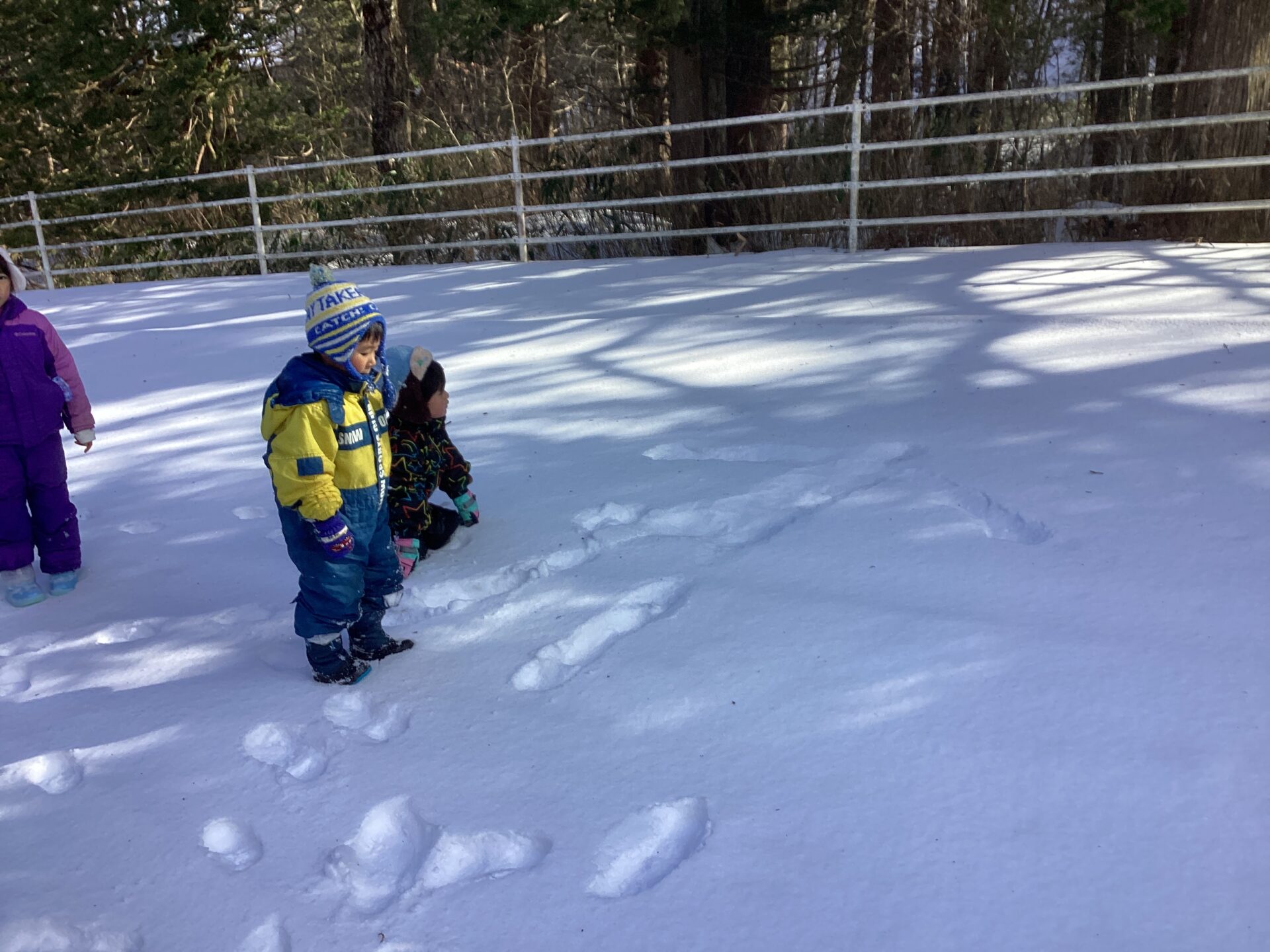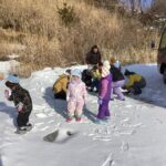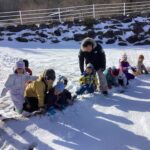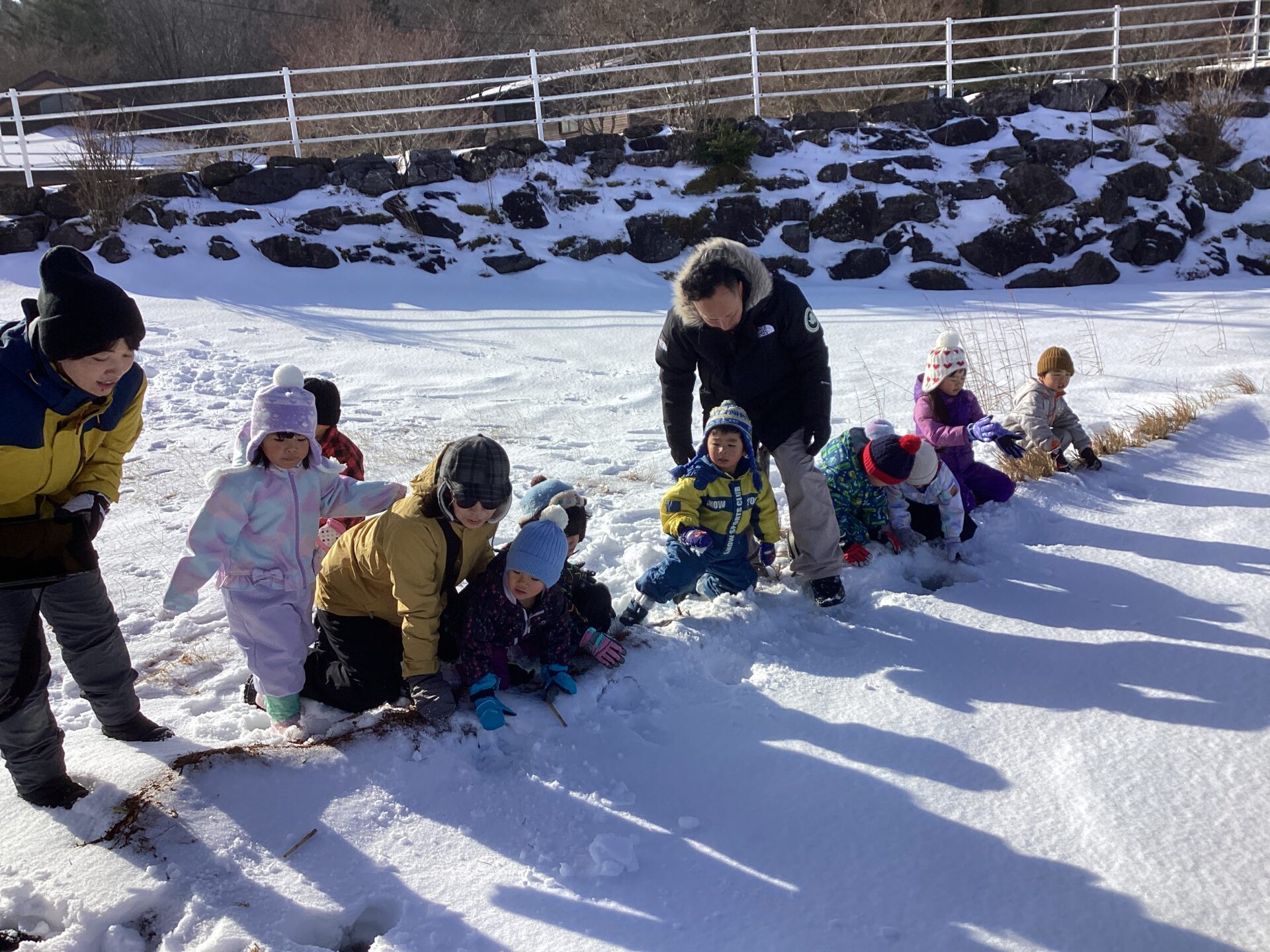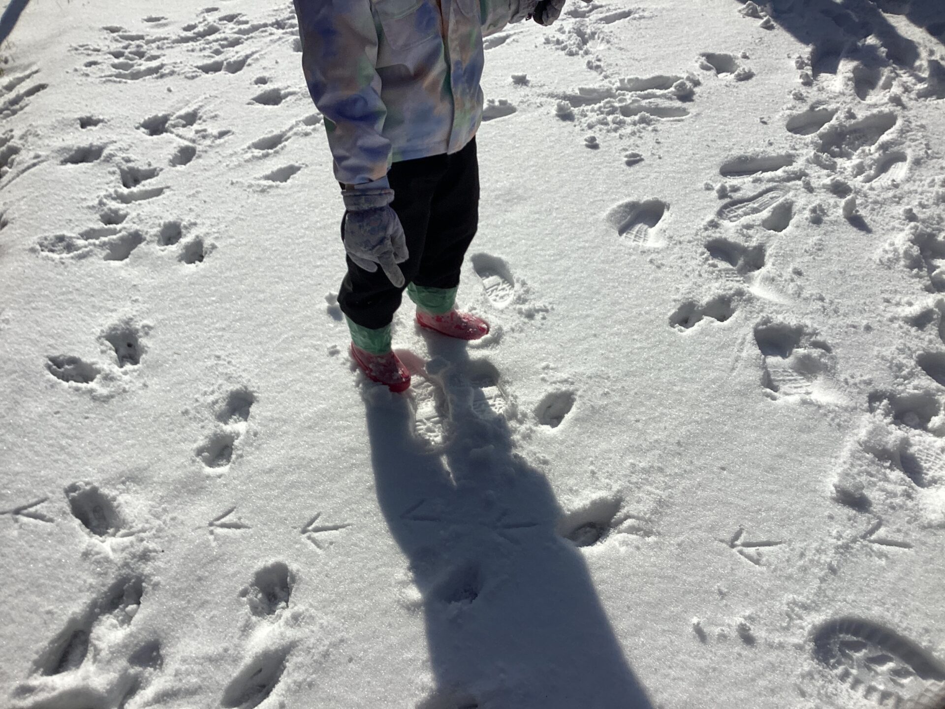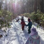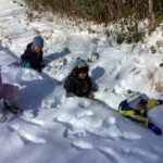 標高が高い茶臼山での活動だったので、天気が心配でしたが、当日は天気に恵まれ絶好のコンディションの中で探検を楽しめました!おかげでシカやキジの足跡や湖の氷、雪のベッドやお風呂等、足元の色々な発見を楽しむ余裕もできたと思います。下見を前日に行ったことも当日の活動のイメージがしやすくなりました。雪がブーツの中に入らずに探検をめいっぱい楽しめるよう、足元を養生テープで巻いたことも、終始楽しんで歩く姿に繋がりました。最初と最後尾にスタッフの方、中間地点に保育士を配置したので、子ども達が自分のペースで様々な発見を楽しめていたと思います。最後にソリ遊びをして帰りましたが、園外活動でスキー場でのソリ滑りを後日控えていたので、良い練習になりました。