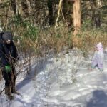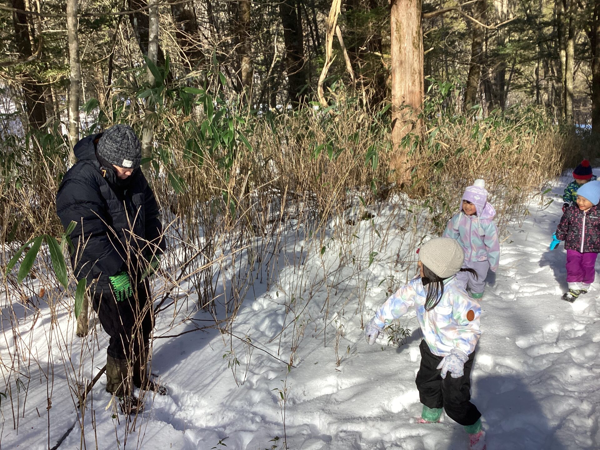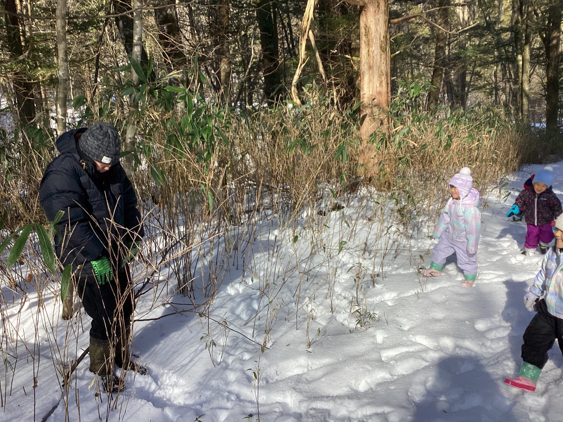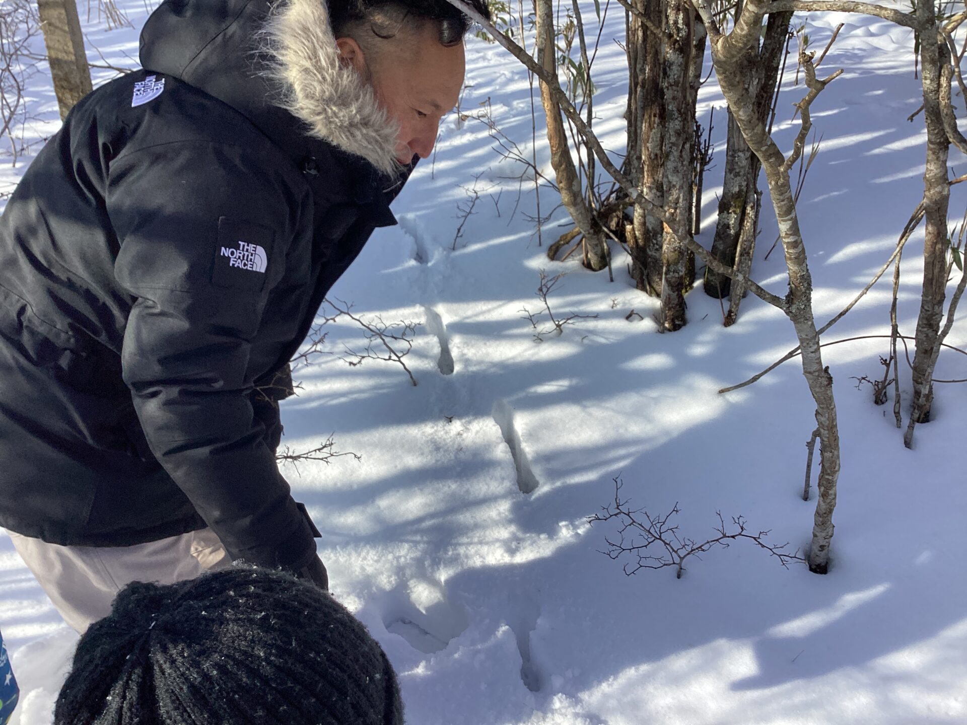 幸山さんにシカの足跡、キジの足跡ということを教えてもらい、しゃがんでじっくり見たり、足跡が続く方へ歩いたりしていました。キジの足跡を見ていた子が、