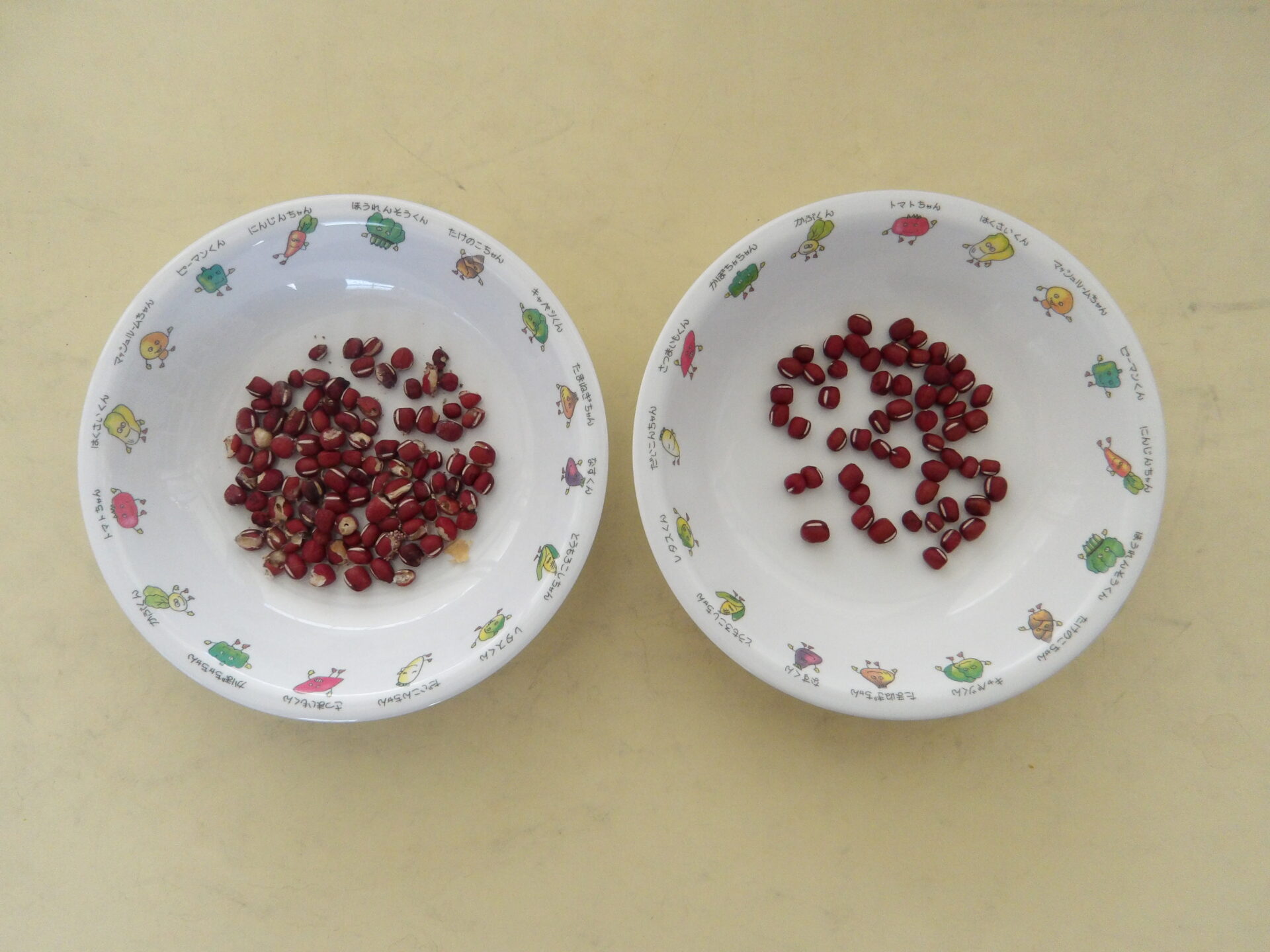 今年度年中ぱんだ組では小豆を育てました。カラカラに乾いた小豆を脱穀してみると…。