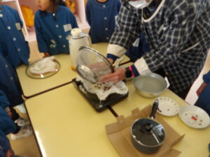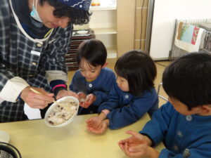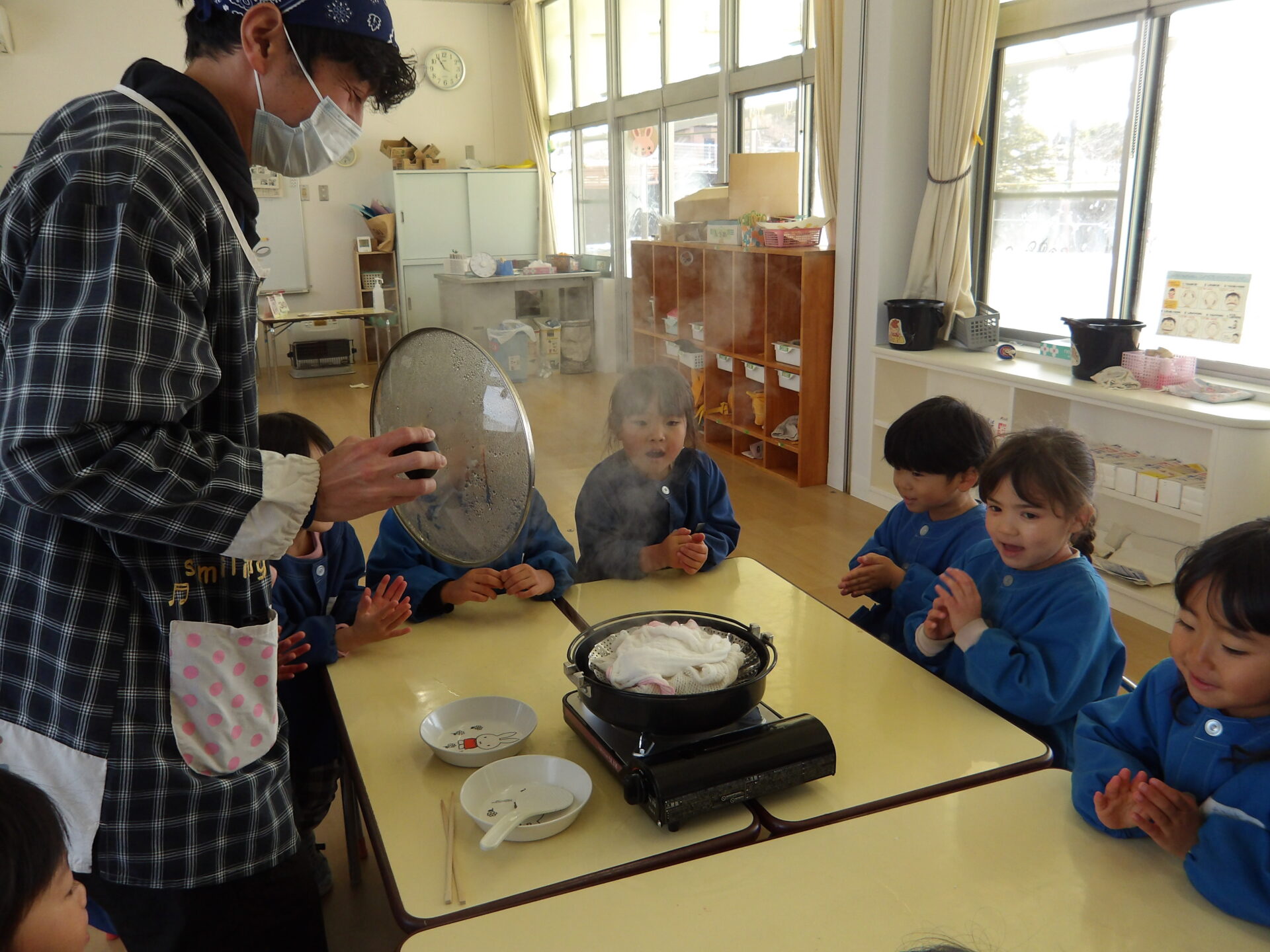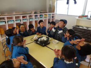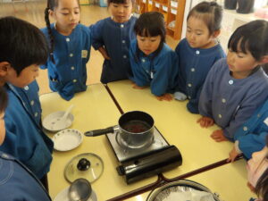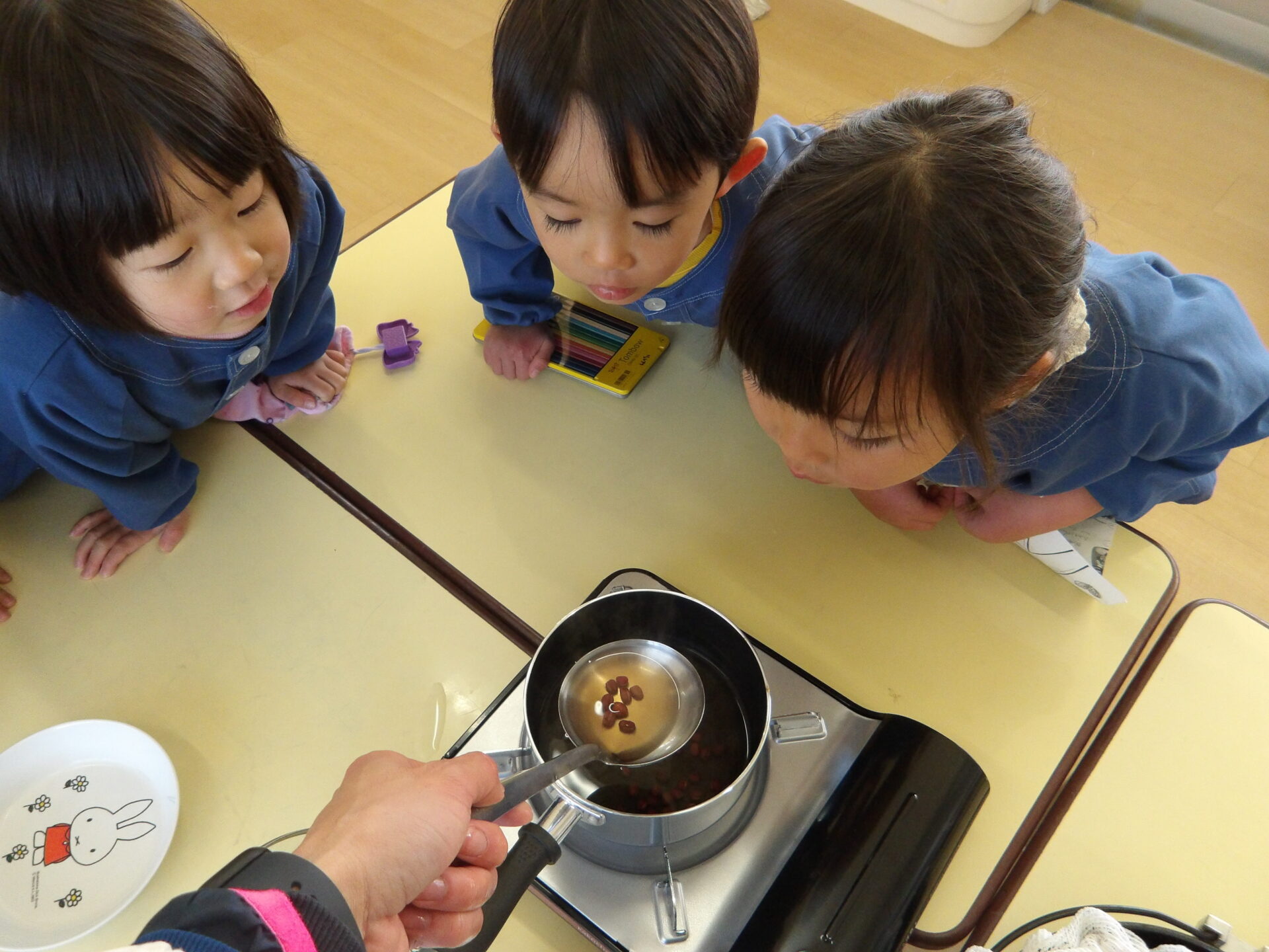 調理する様子を初めて見る子も多く、ちょっとした変化に気付き子どもたちの呟きがたくさんありました。目の前で調理するということで、保育士としては”美味しく作ってあげないと”と緊張感はありましたが、給食室で作っていただくのでなく、目の前で調理して完成していく実体験が大事ということを改めて感じました。大量の収穫にはなりませんでしたが、クラスの友だちと育てた小豆をクラスの友だちと美味しく食べられたことで、小豆の収穫は大成功だったと思います!!