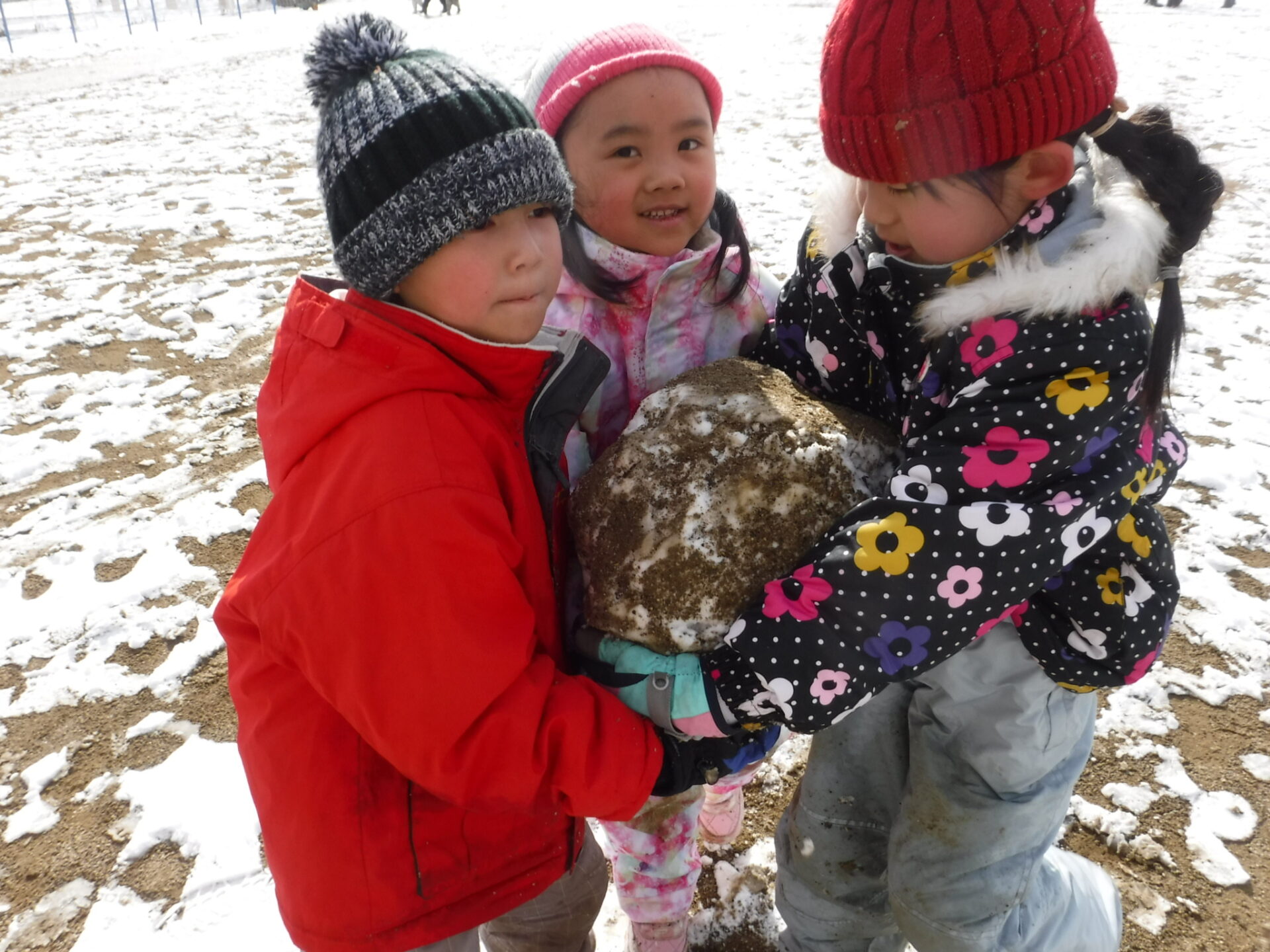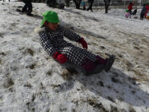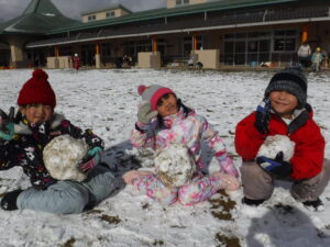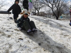 園庭にやっと少し雪が積もりました。子どもたちにとっては待ちに待った雪遊びです。