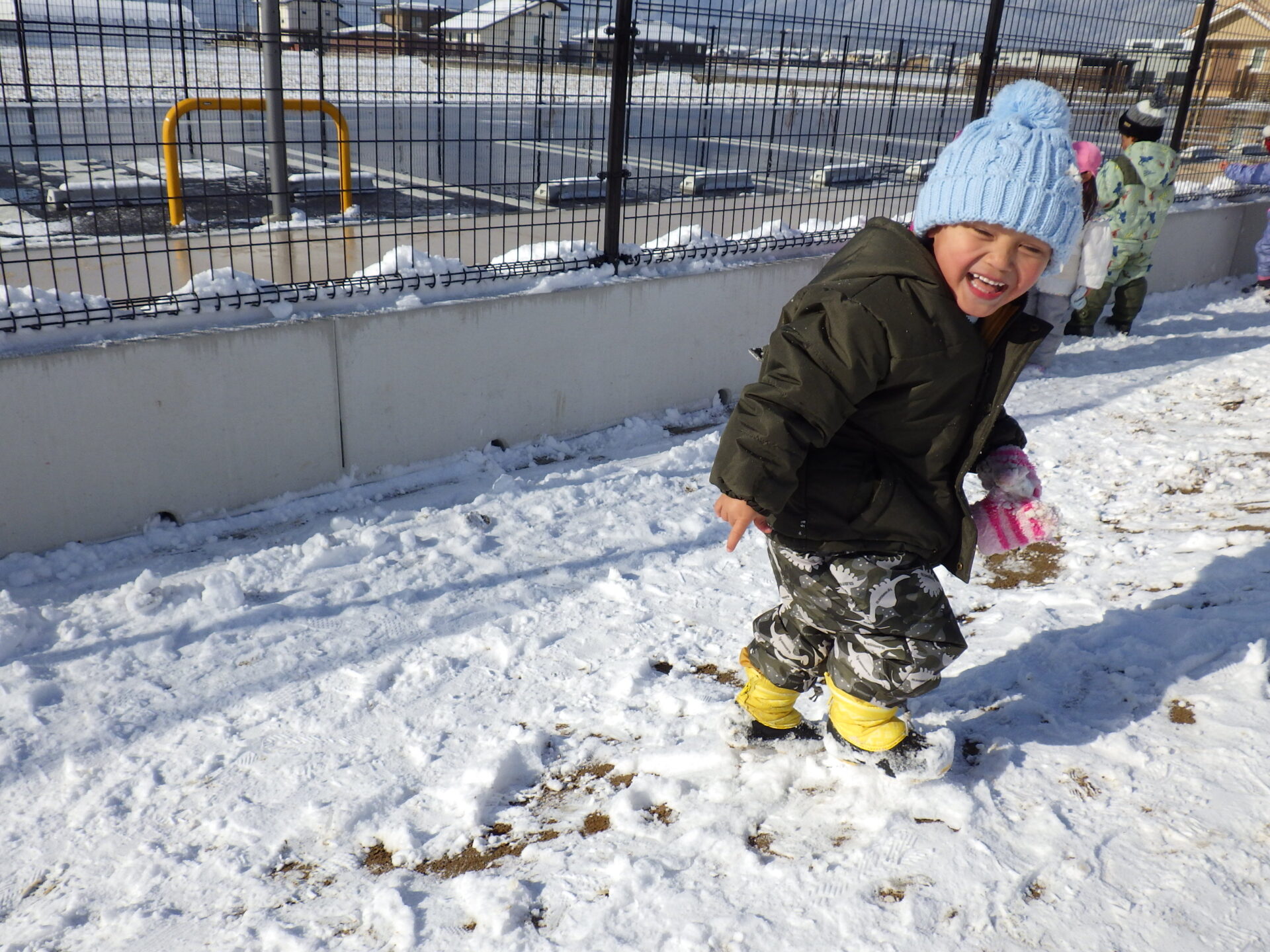 雪は冷たい!でも、雪は色んな遊びができて楽しい!! と、子どもたちは園庭中を走り回って雪遊びを楽しみました。