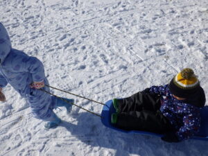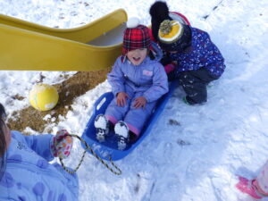 そり遊びでは、はじめは平らな所では動かず、どうしようかなと思っていると、お友達が引っ張ってくれて少し動くことに気が付きました。