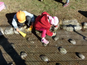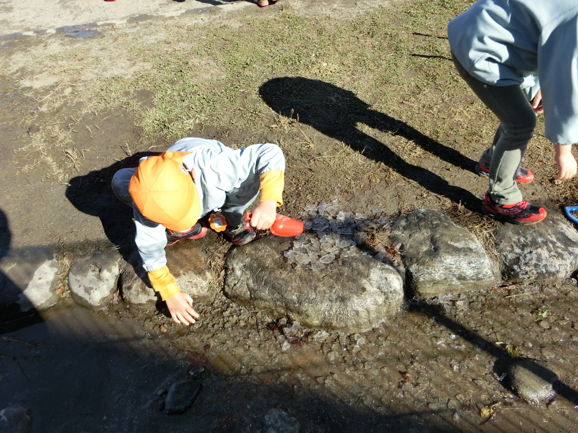 氷だけでもいろいろな遊びを見つける子どもたち。自然の中でいろいろな体験ができます。
