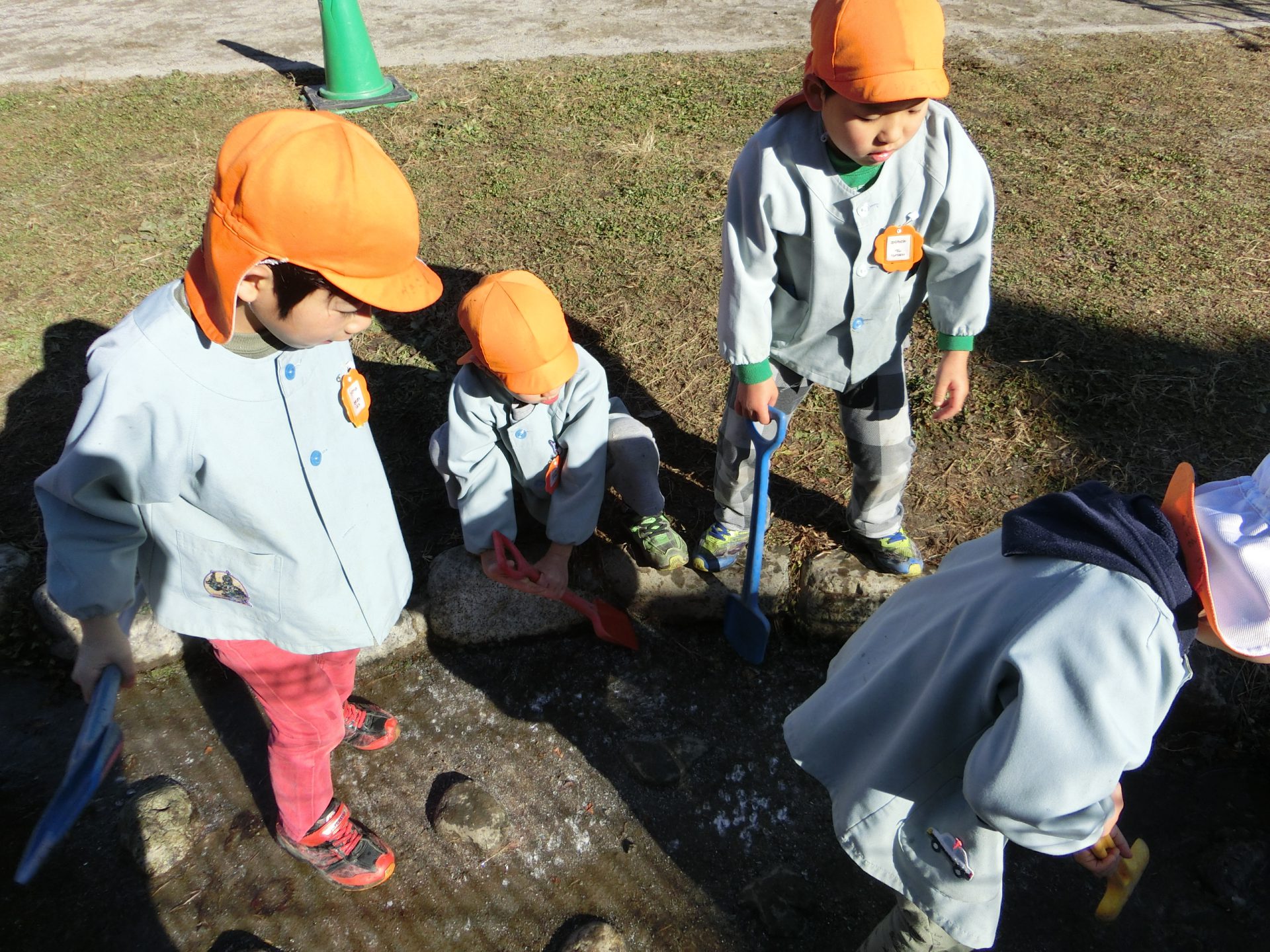 これはまだ11月の終わりくらいの時です。東みのわ保育園の通称「ビオトープ」にうっすら氷が張りました。