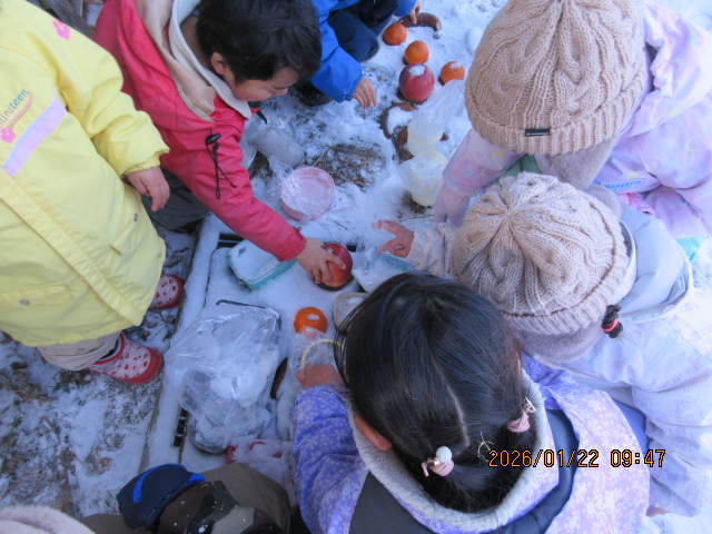 ビニール袋に水を入れて外に置きました。1時間後にはカチンコチン!みかん、バナナ、リンゴも!