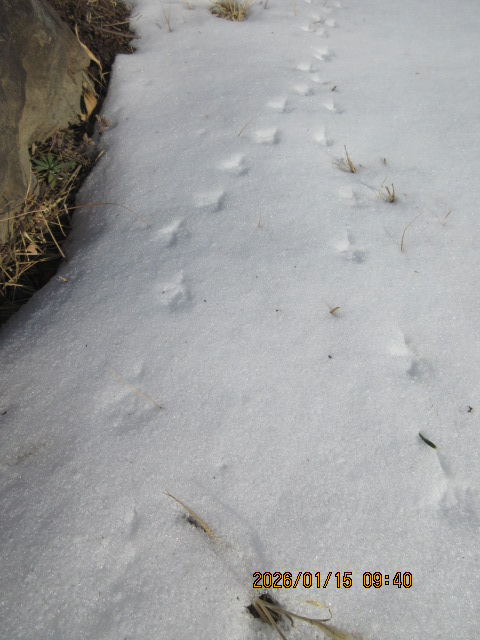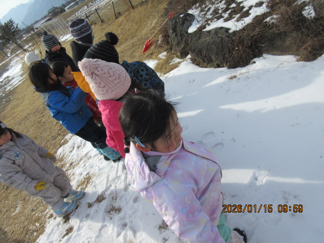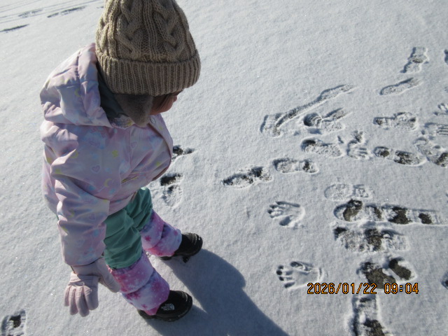 そり遊びをしながら、動物の足跡を見つけました。「鳥さんかな?ねずみさんかな?」