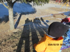冬の朝。みんなで木の影を見ながら。「木のかげ、ながーい」「ぼくたちも足なが~い!大人だね♪」