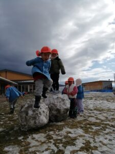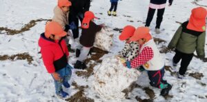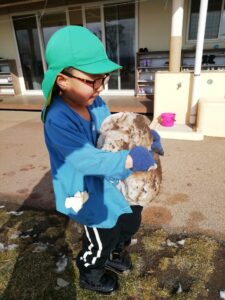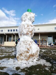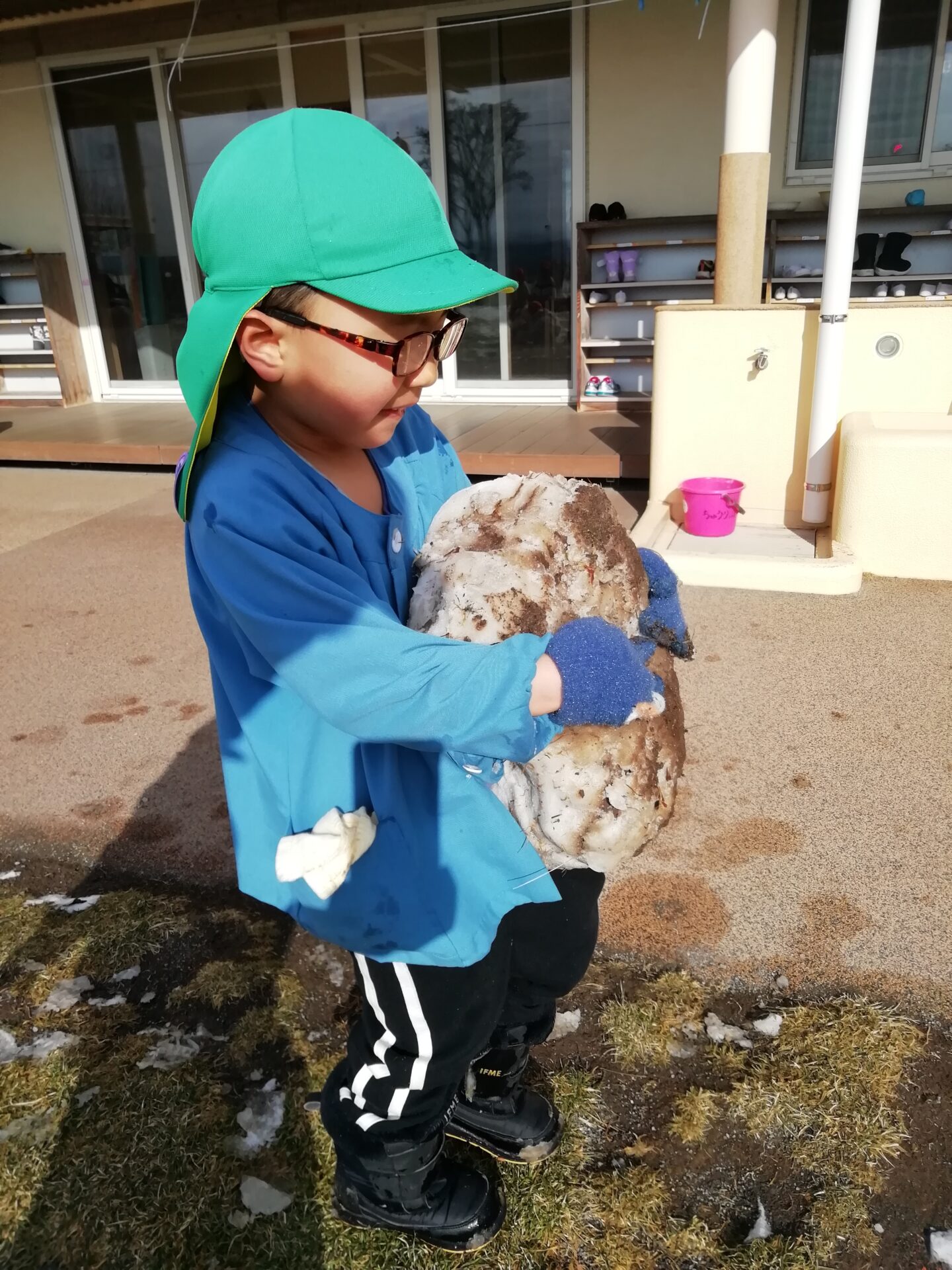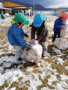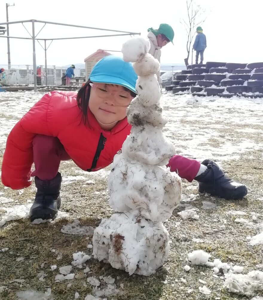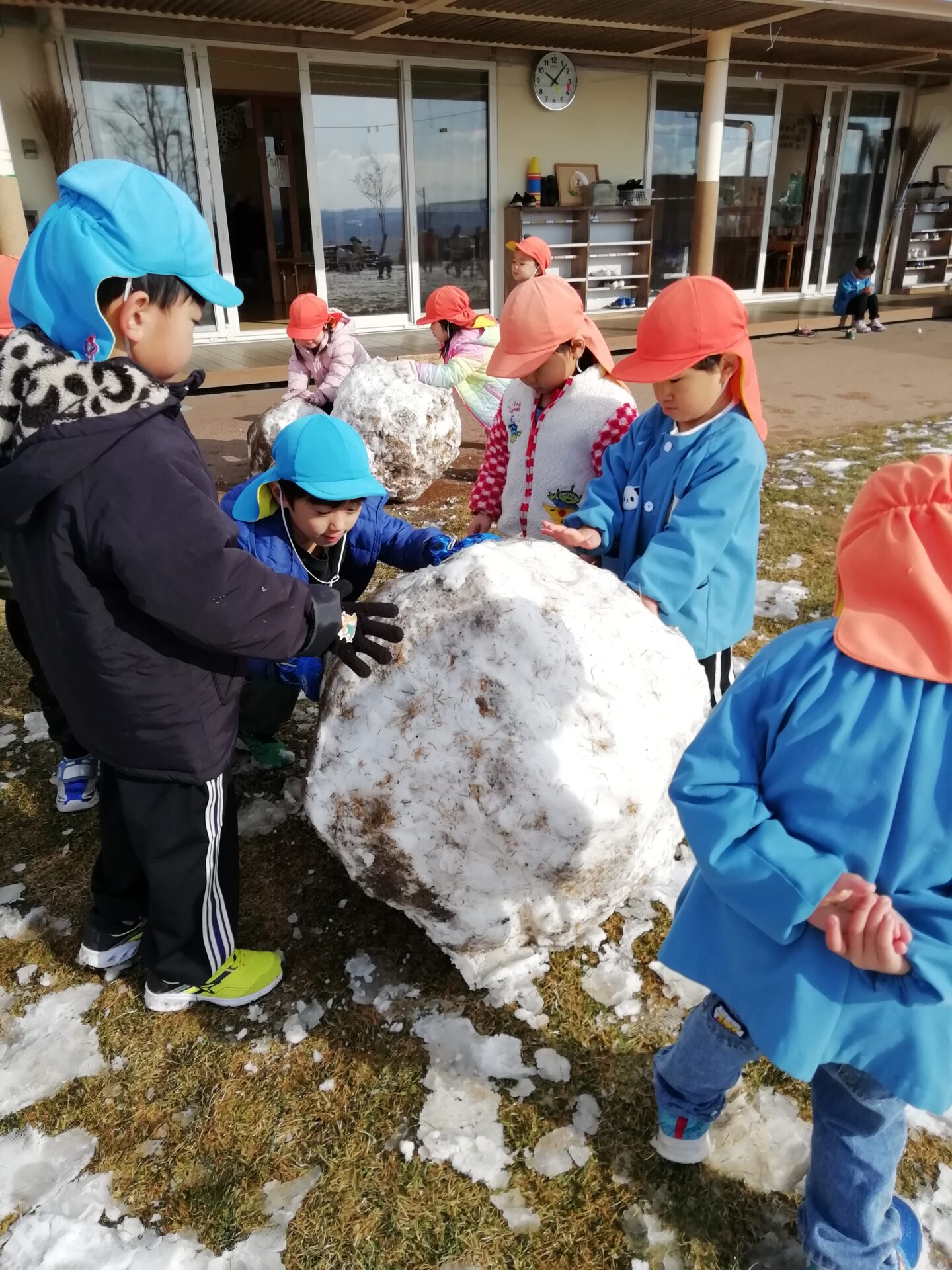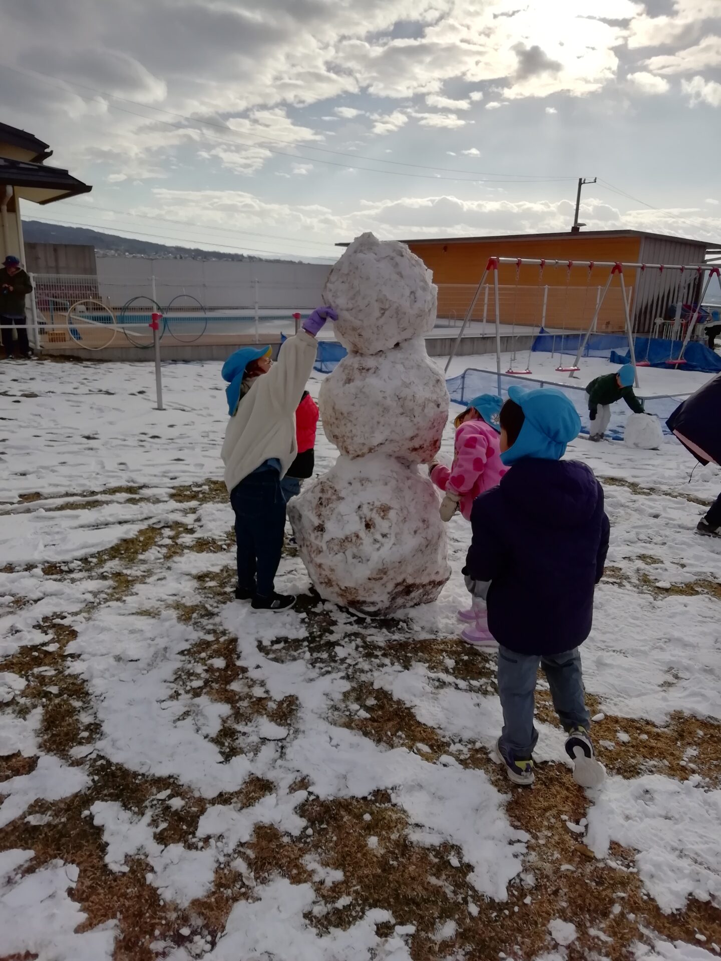 雪の感触や冷たさを感じながら雪あそびを楽しみました。友達と一緒に力を合わせて1つの雪だるまを作ったり、異年齢の友達とも関わりながら雪あそびを楽しみました。「かんせーい!」と嬉しそうな表情を浮かべていました。【5歳児】