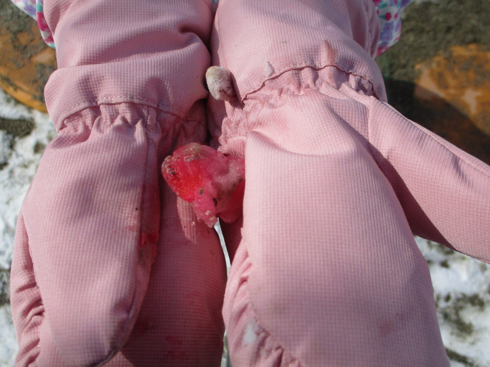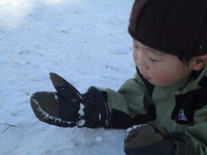 “てぶくろに雪がついたな。冷たくないぞ。”と手袋をしたら冷たくないことに気付いているようでした。
