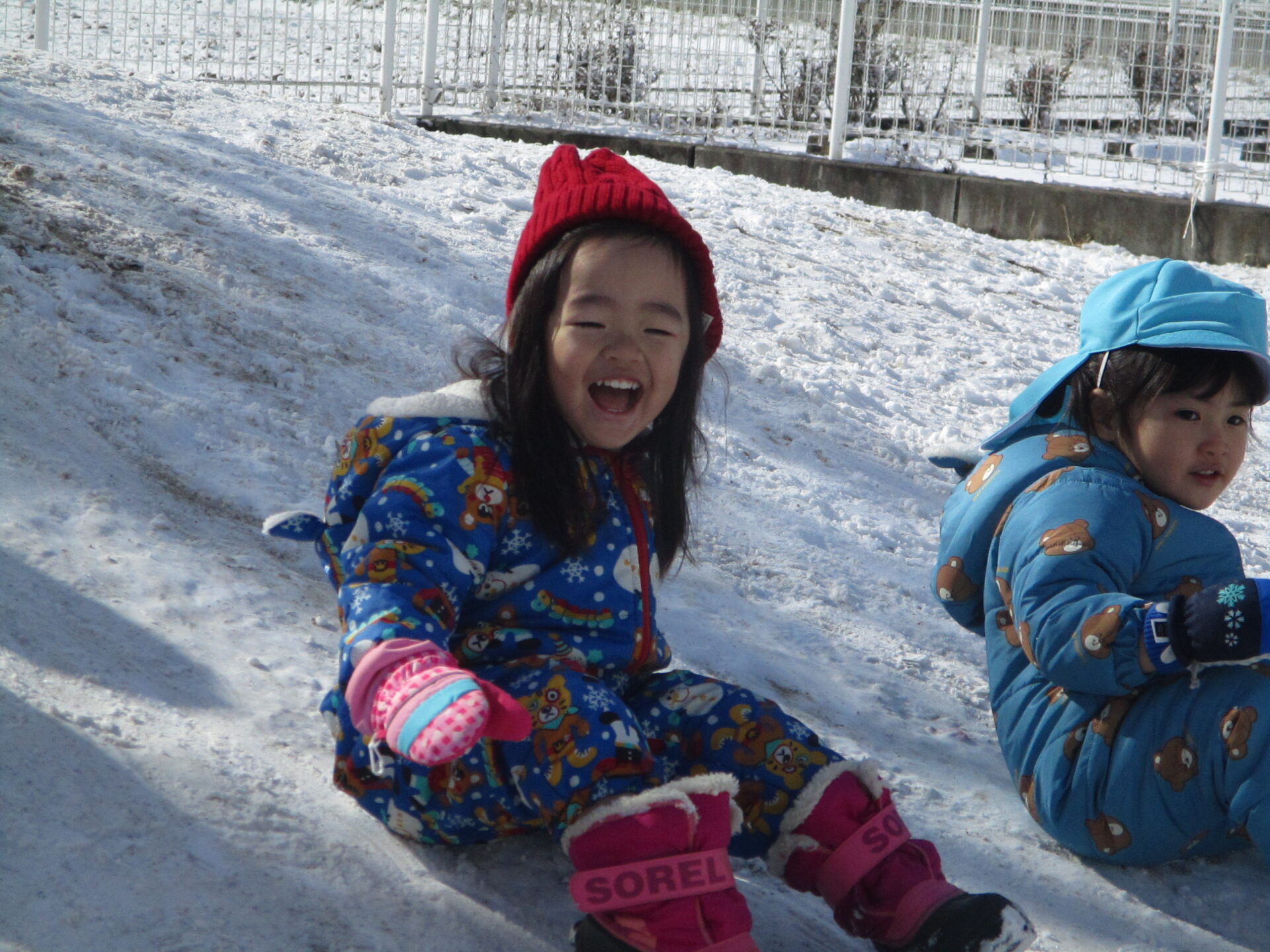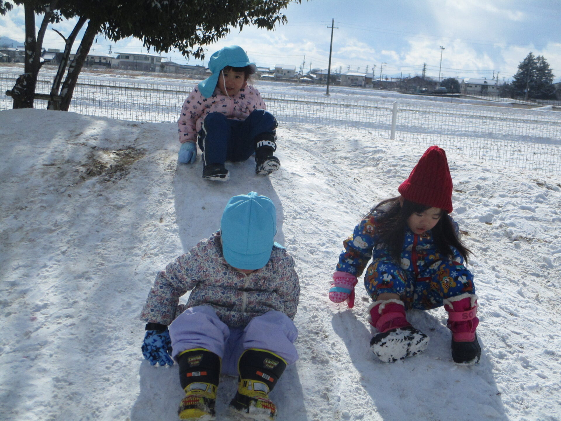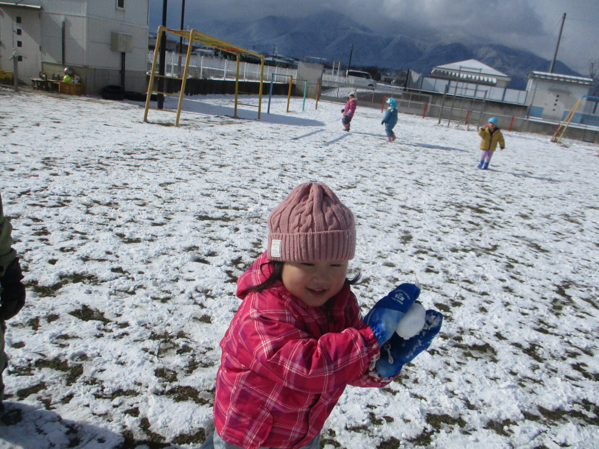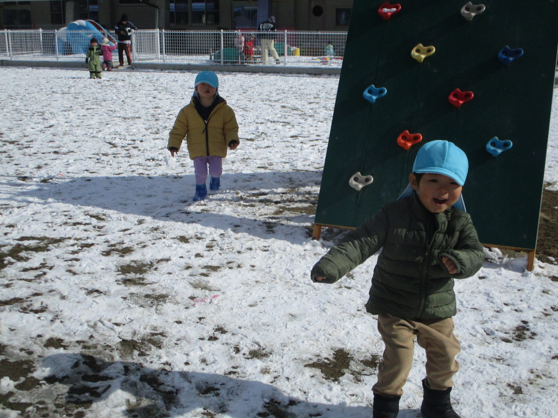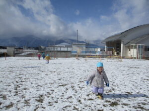 真っ白になった園庭を走りまわったりすべったりして思い切り動きまわってあそんでいました。