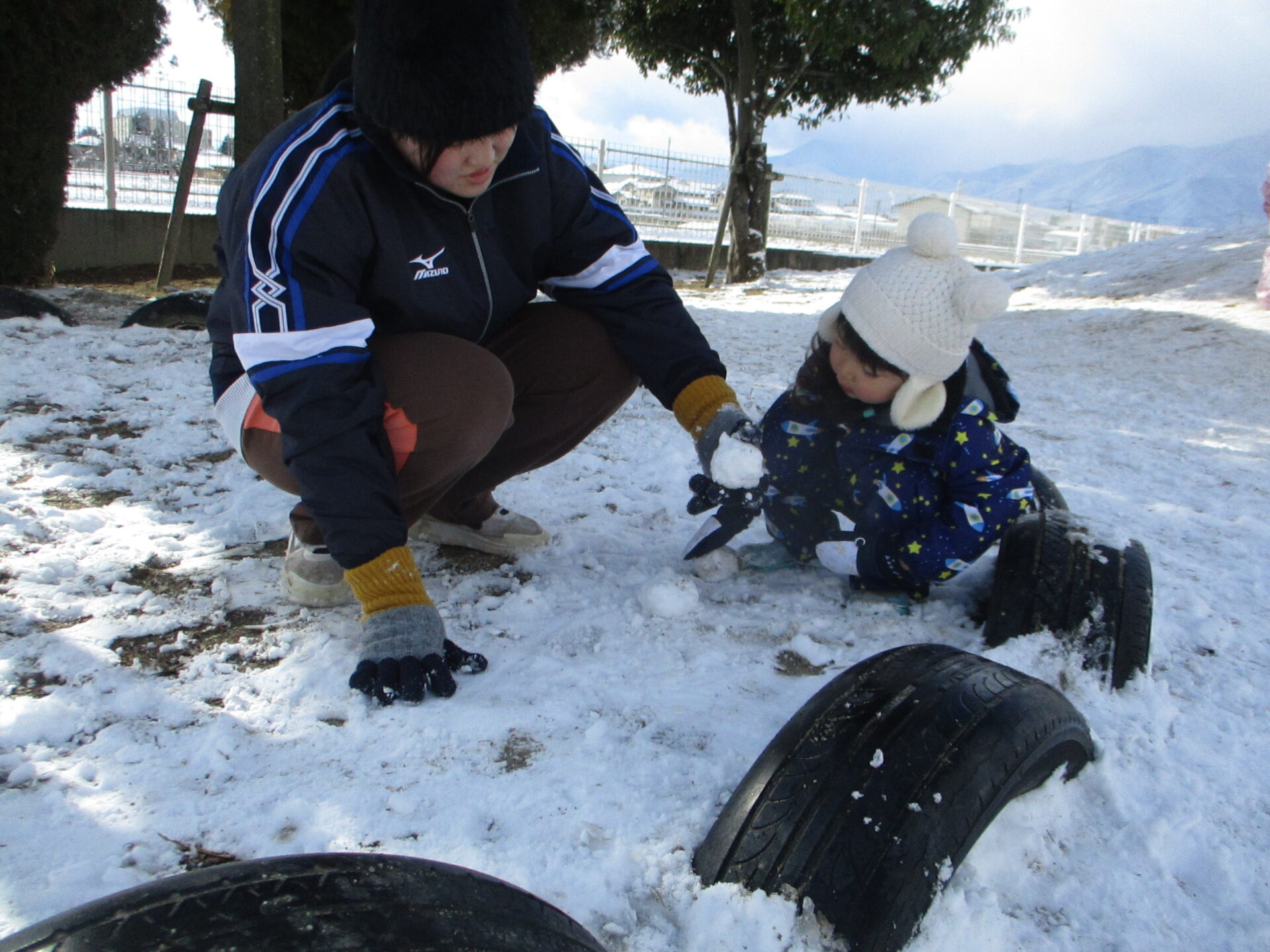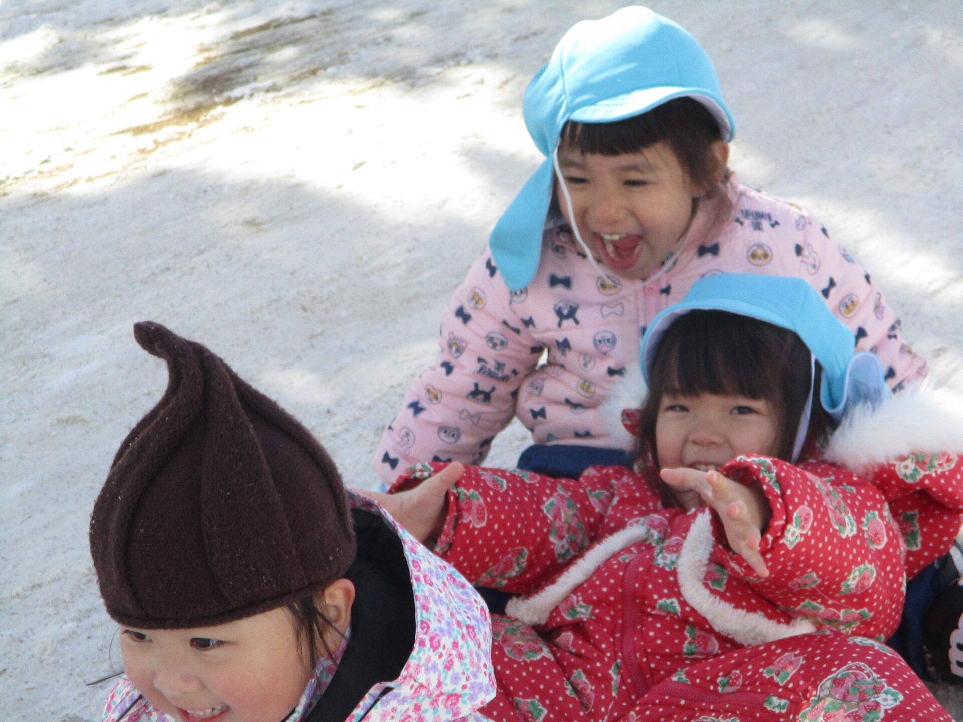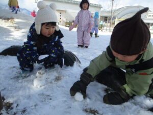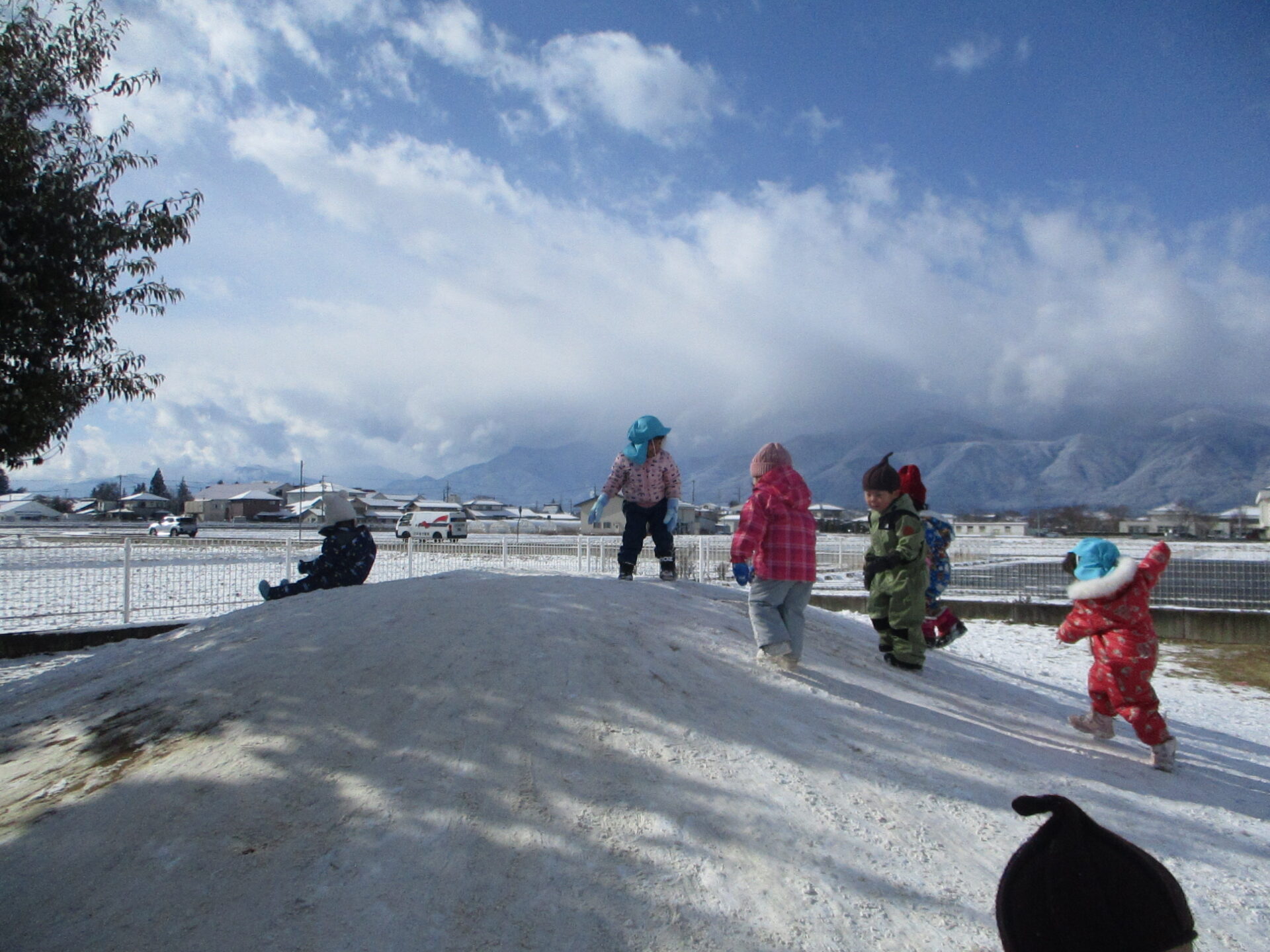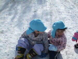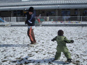 真っ白になった園庭を走りまわったりすべったりして思い切り動きまわってあそんでいました。