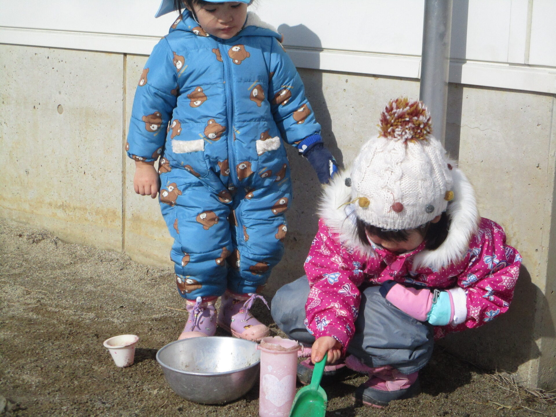 雪がとけたことを2歳児さんなりに考えて友達と話し合っていました。
