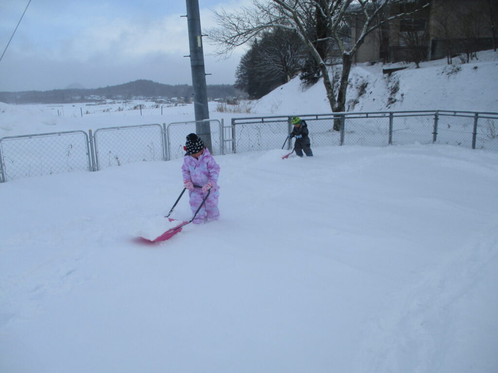 するとさすが、信濃町の子どもたち!「除雪しないとね!」とスノーダンプを持ってきて一生懸命に歩く道をつくっていましたよ。いつも除雪しているのを間近で見たり手伝ったりしている子も多いからこその気づきだなと感心してしまいます。
